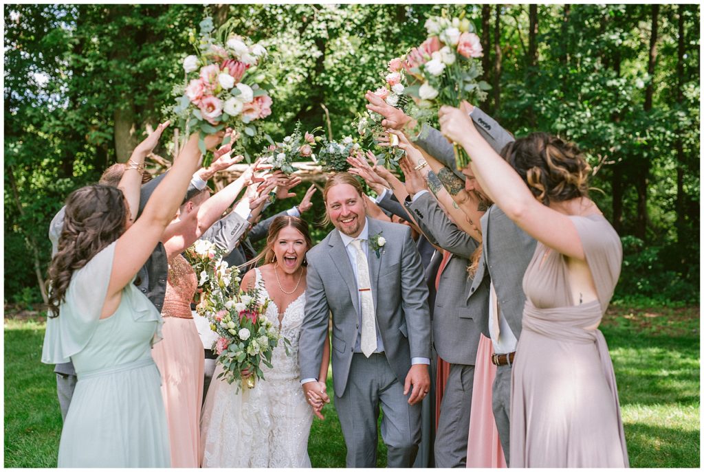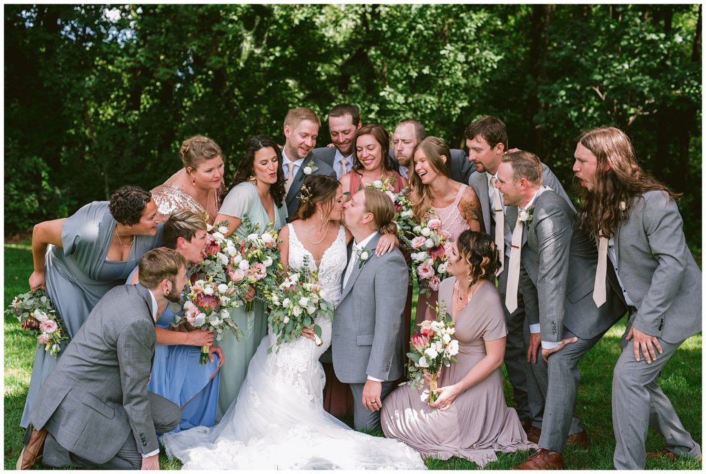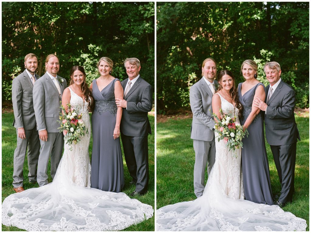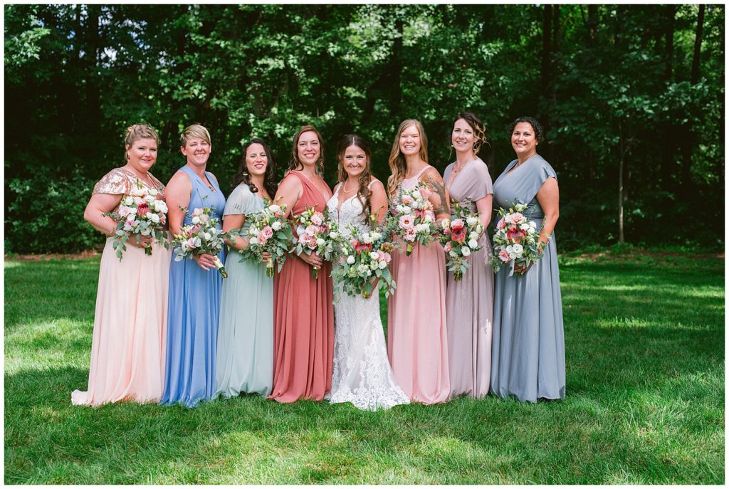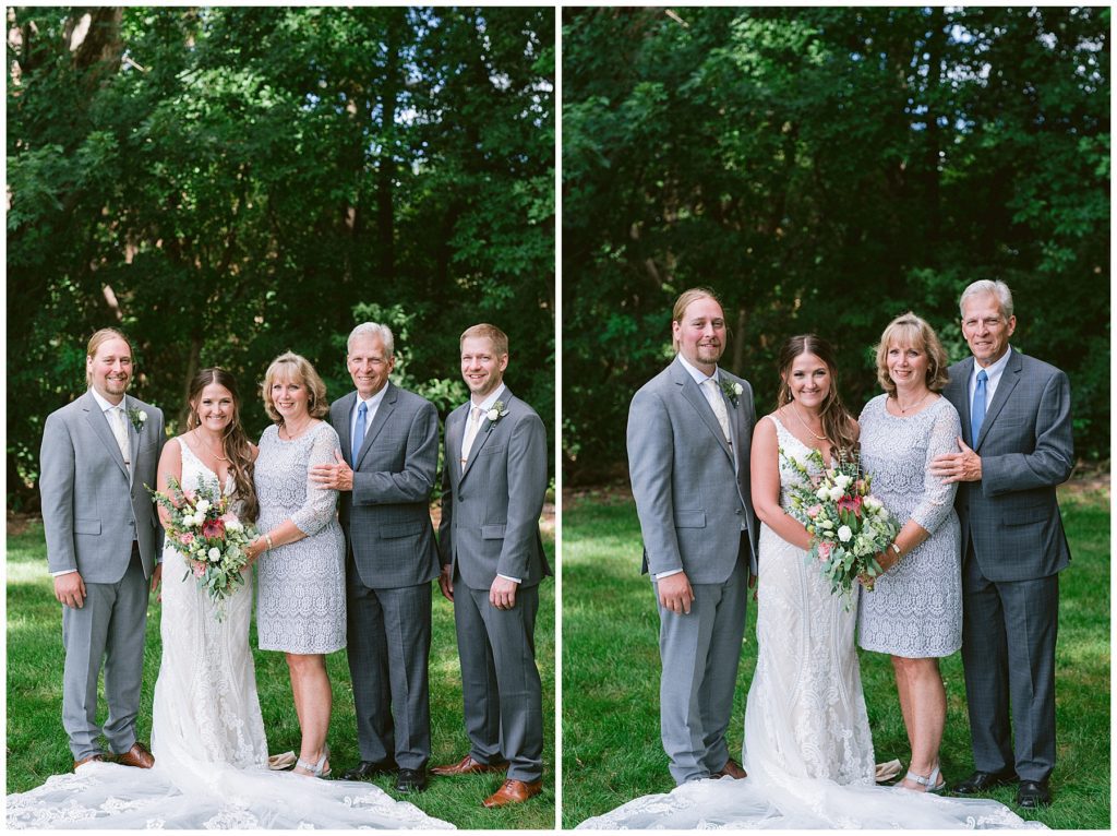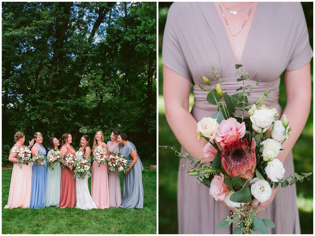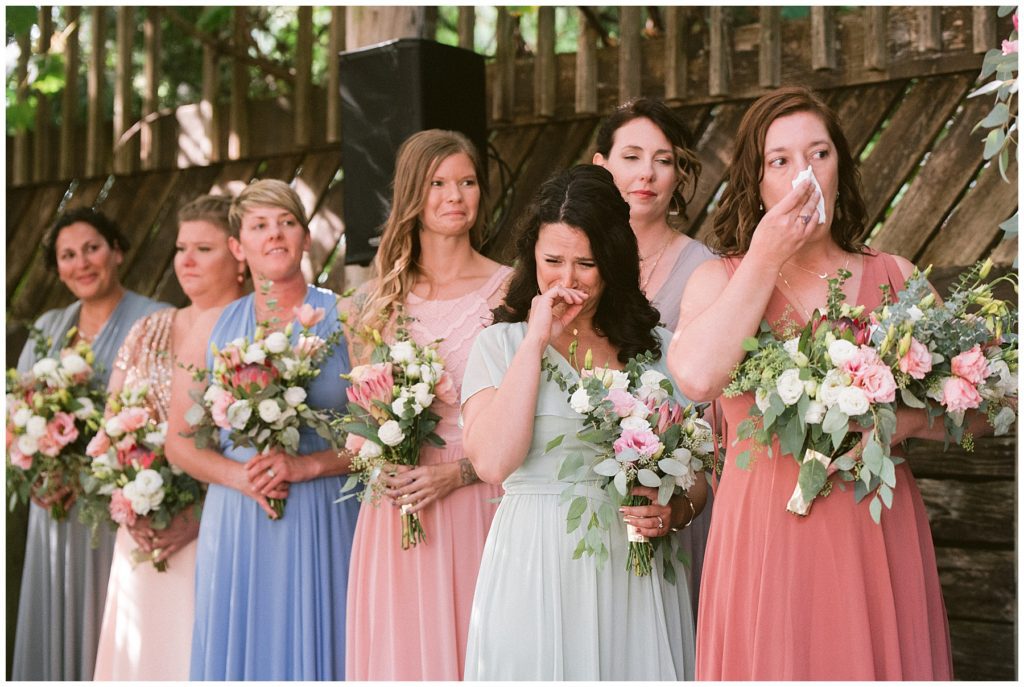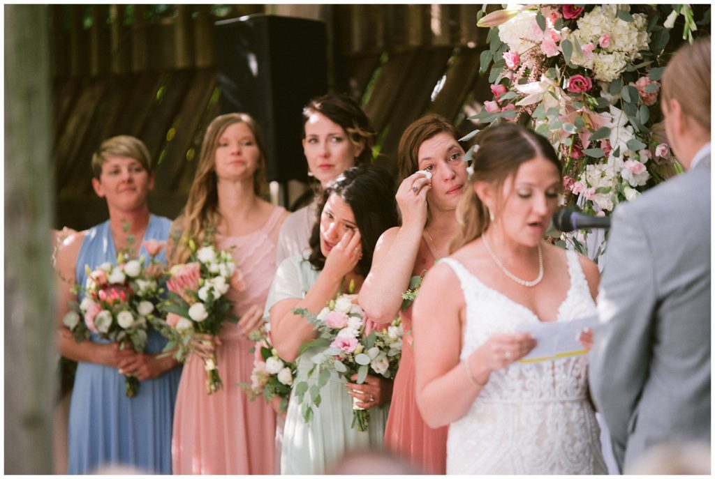 Adam’s mother was a genus with the florals, and made gorgeous bouquets for the women that looked beautiful against the neutral palette of dresses they all wore. Adam and his groomsmen wore grey suits that when put up against the green backdrop looked incredible.