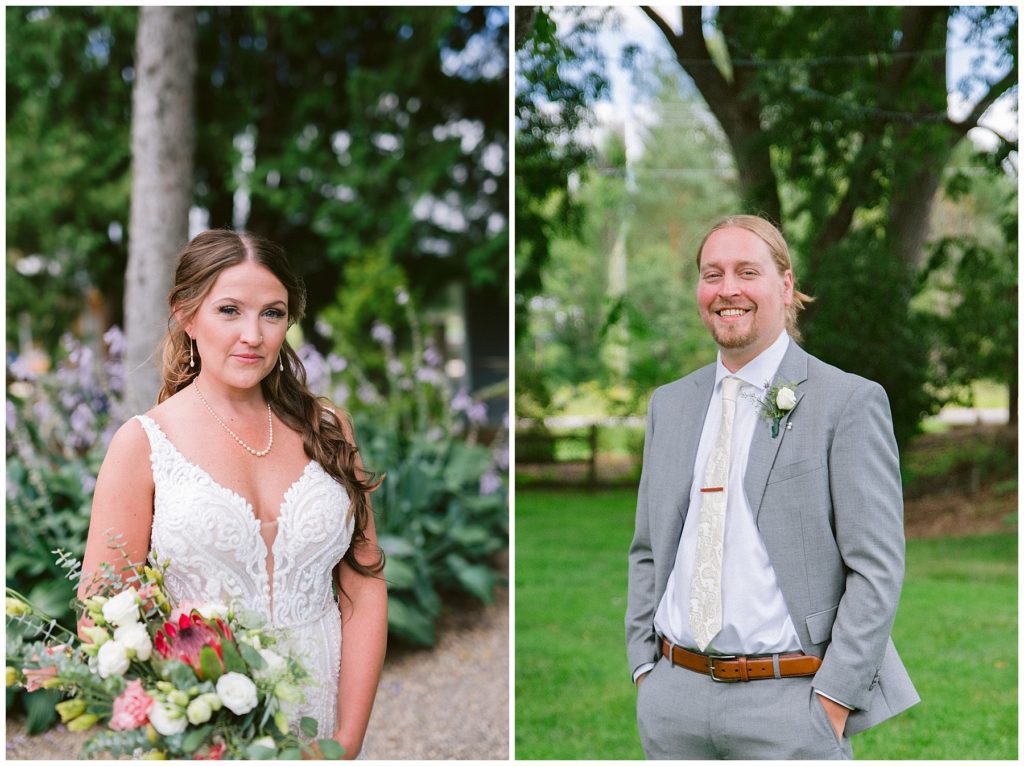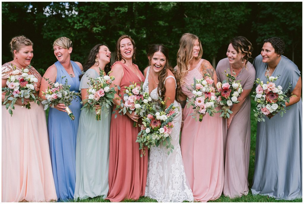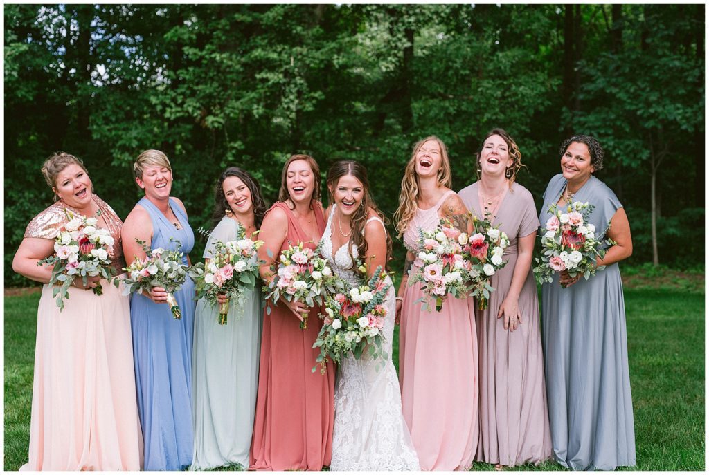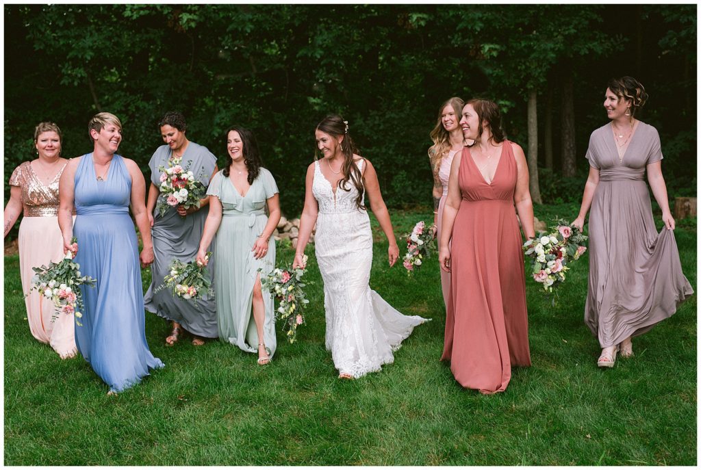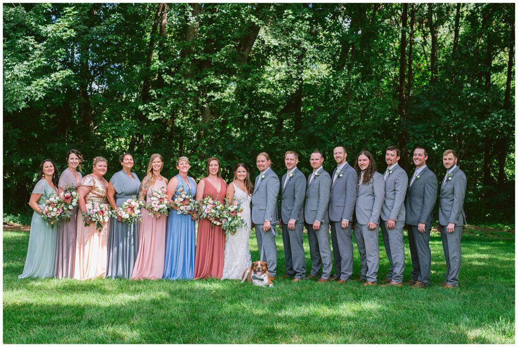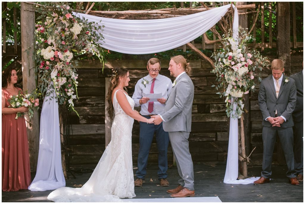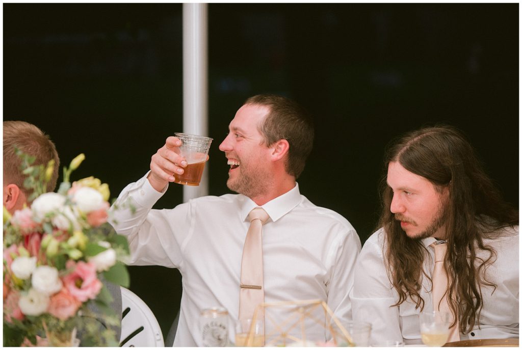 Adam’s mother was a genus with the florals, and made gorgeous bouquets for the women that looked beautiful against the neutral palette of dresses they all wore. Adam and his groomsmen wore grey suits that when put up against the green backdrop looked incredible.