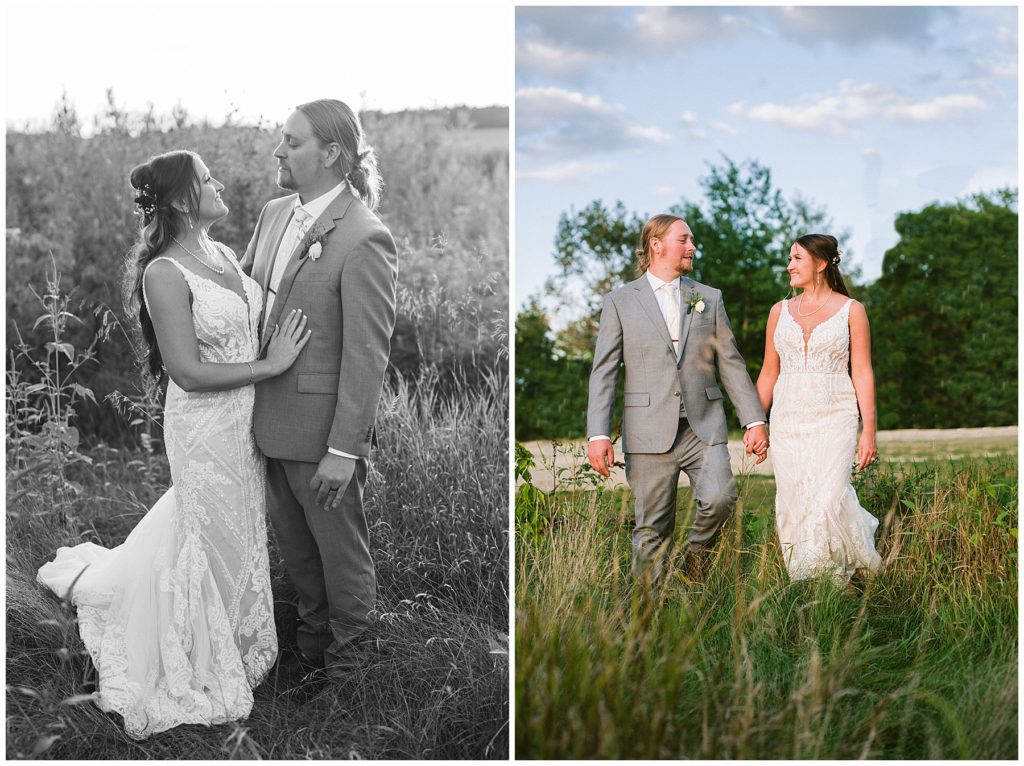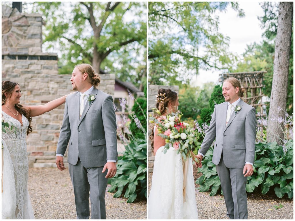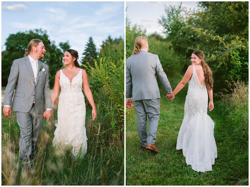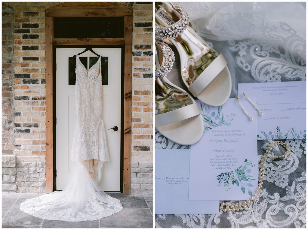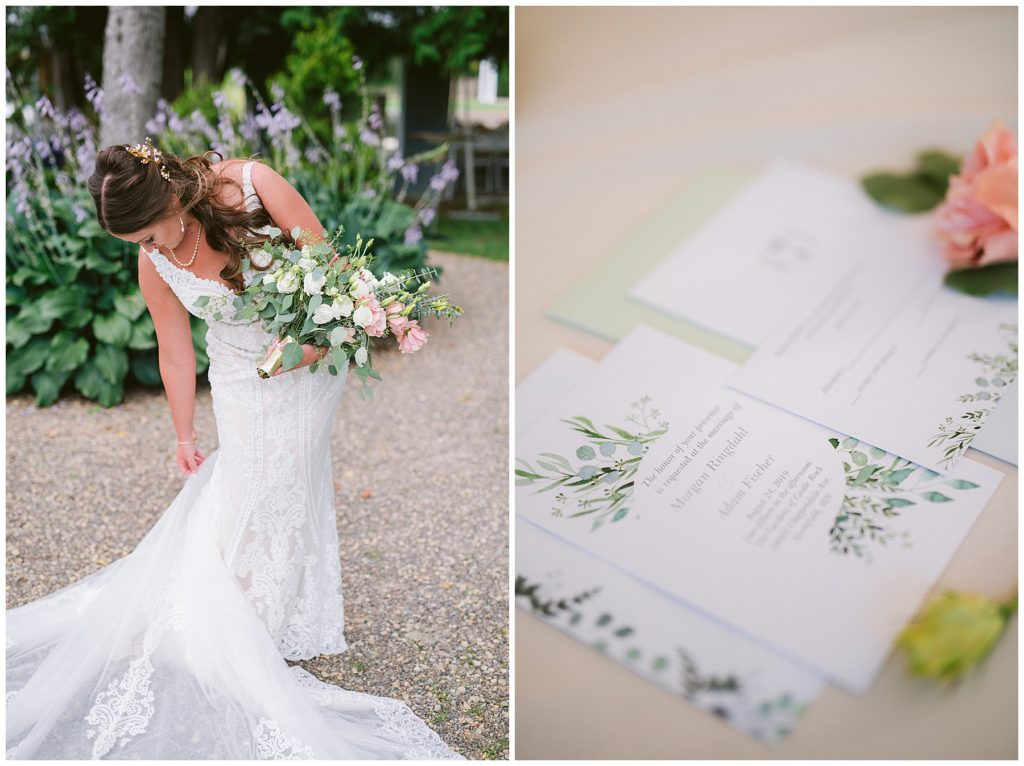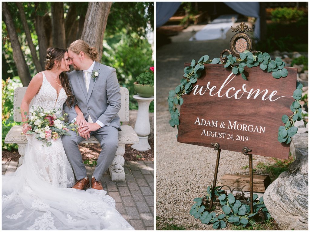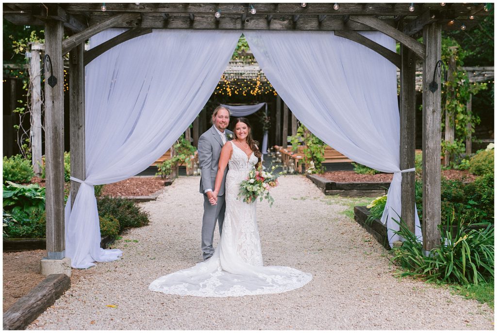 Their beautiful wedding day incorporated all the things that Morgan and Adam love, especially music and friendship. Among the beautiful space at the Garden’s of Castle Rock in Northfield, the couple were wed under a beautiful trellis of grapevines and florals. Morgan wore a beautiful Martina Liana gown with a train to die for. She also wore pearls that were her grandmothers and her mother’s bracelet.