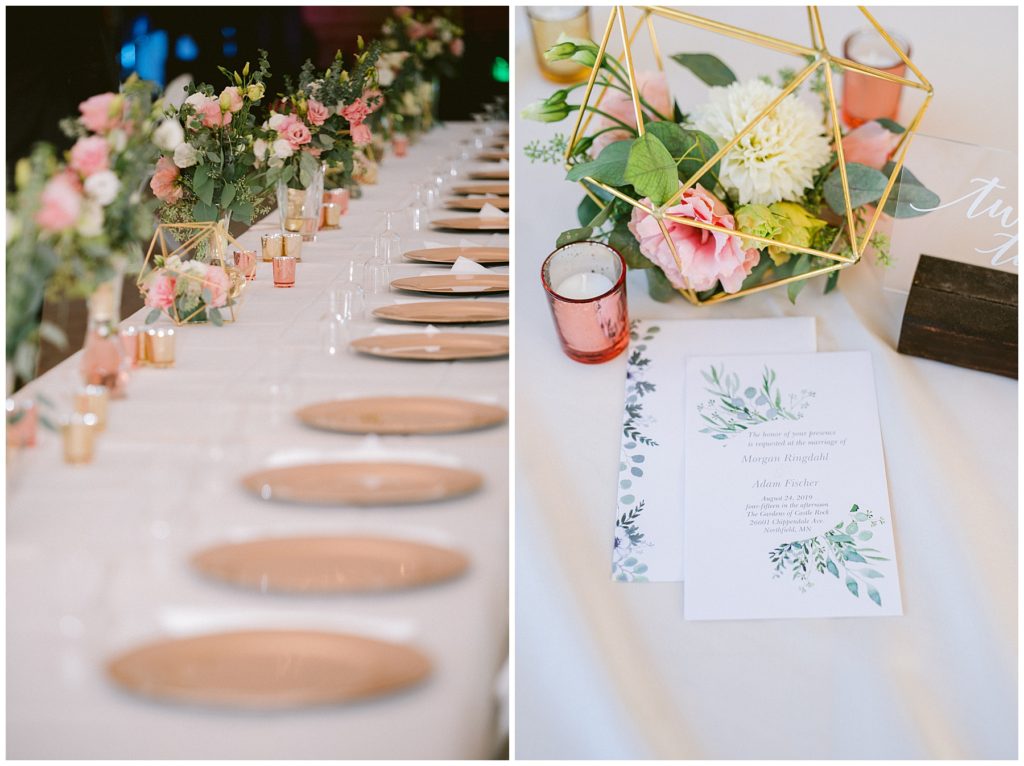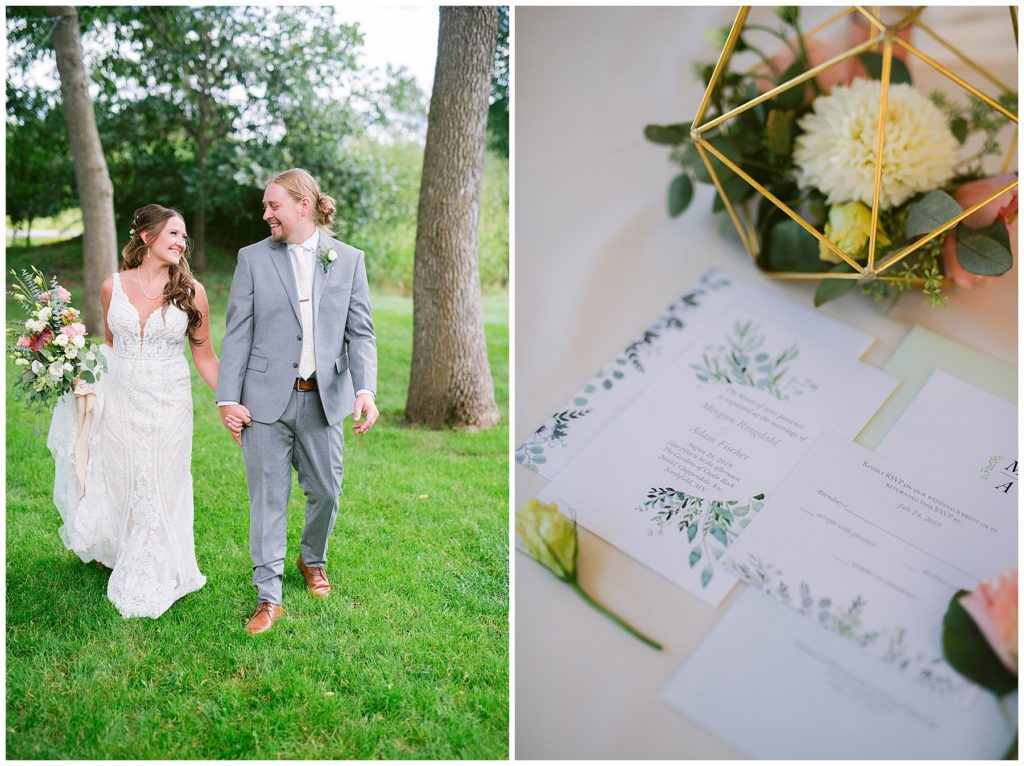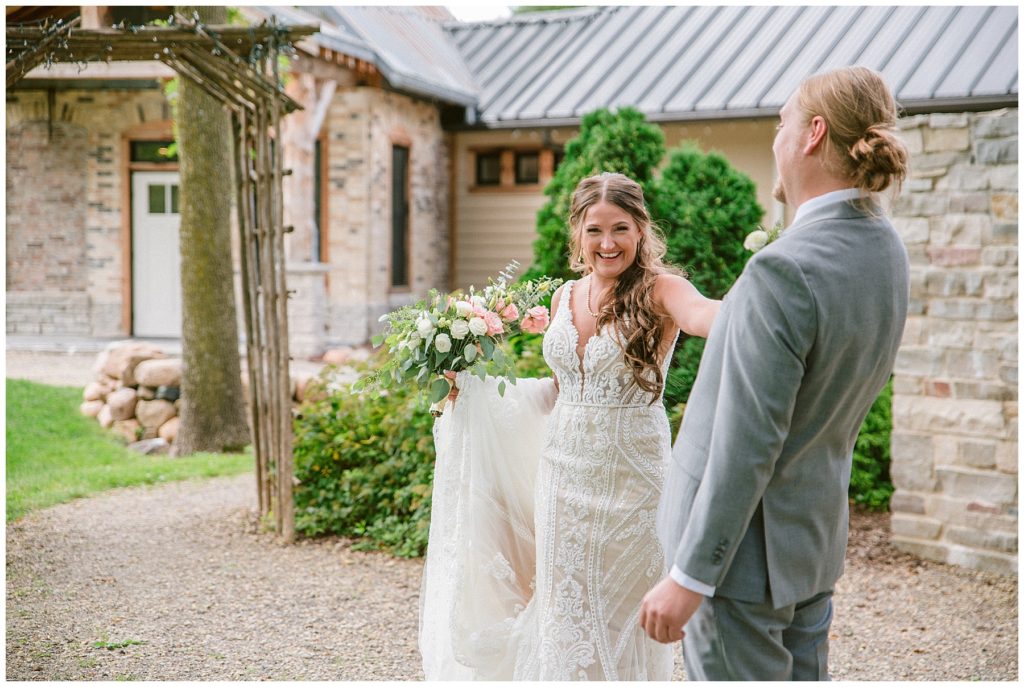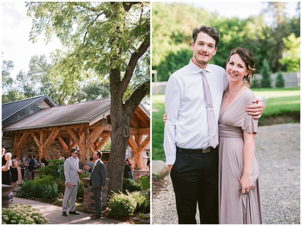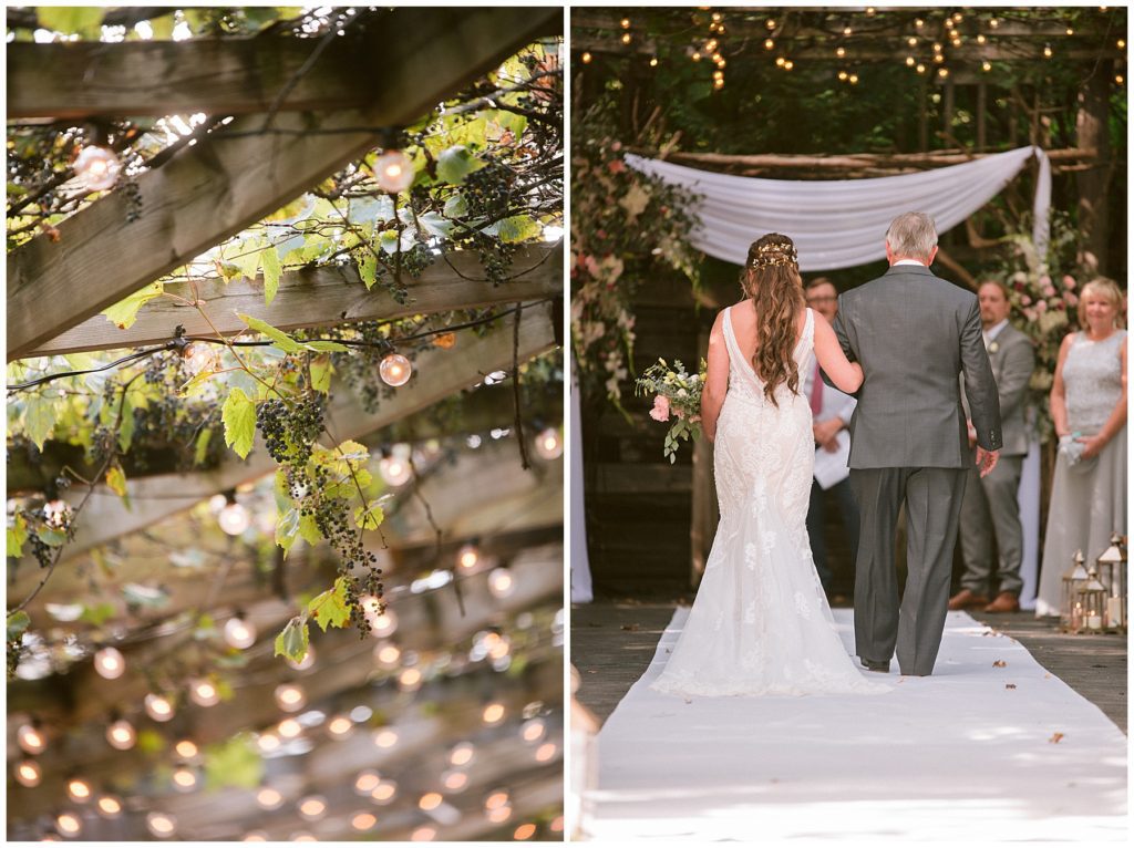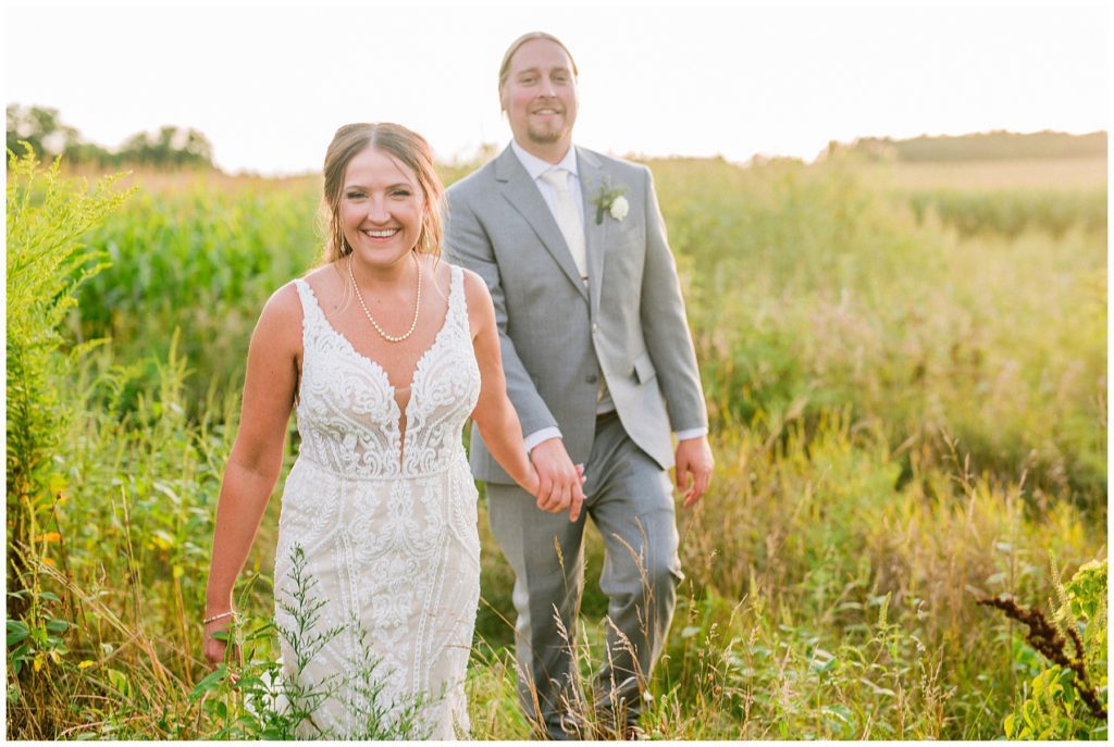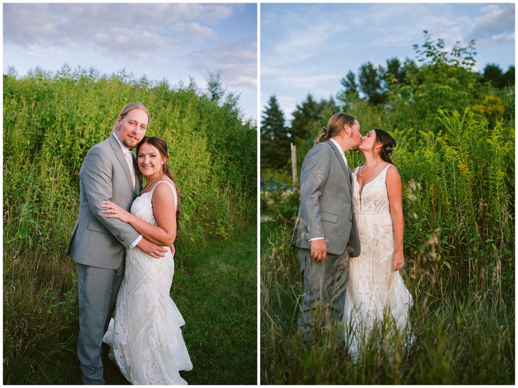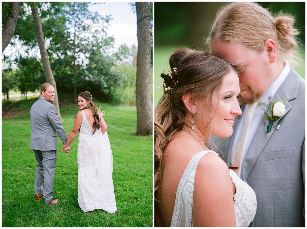 Their beautiful wedding day incorporated all the things that Morgan and Adam love, especially music and friendship. Among the beautiful space at the Garden’s of Castle Rock in Northfield, the couple were wed under a beautiful trellis of grapevines and florals. Morgan wore a beautiful Martina Liana gown with a train to die for. She also wore pearls that were her grandmothers and her mother’s bracelet.
