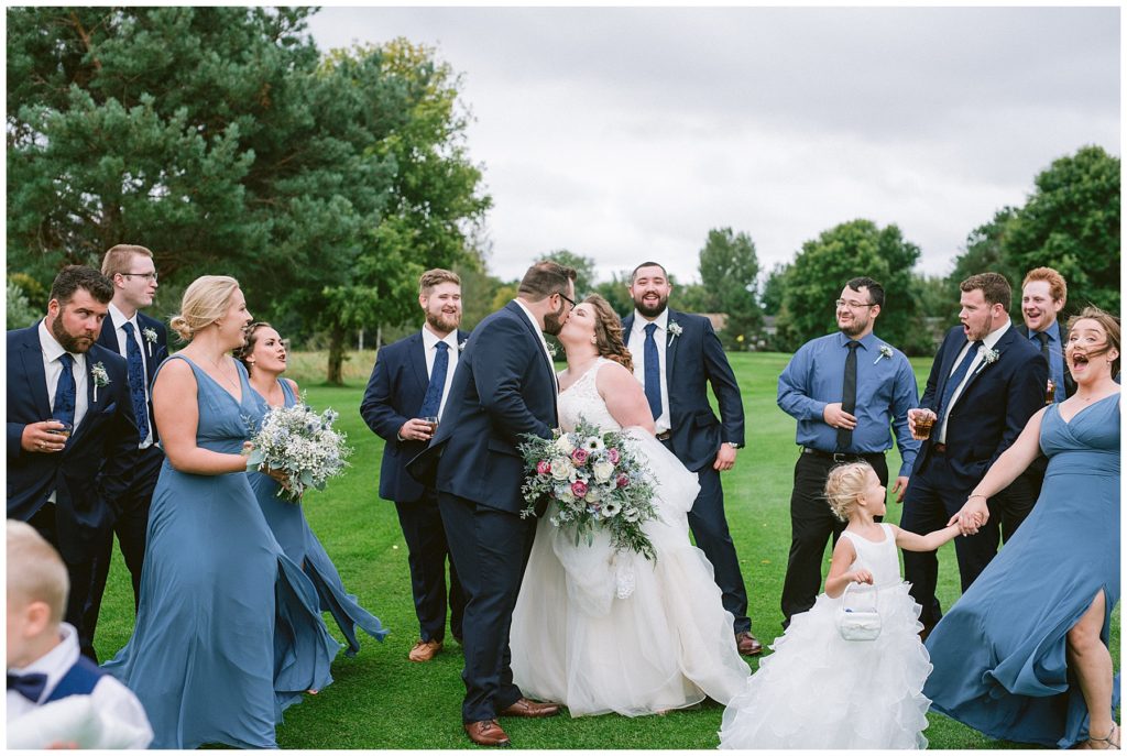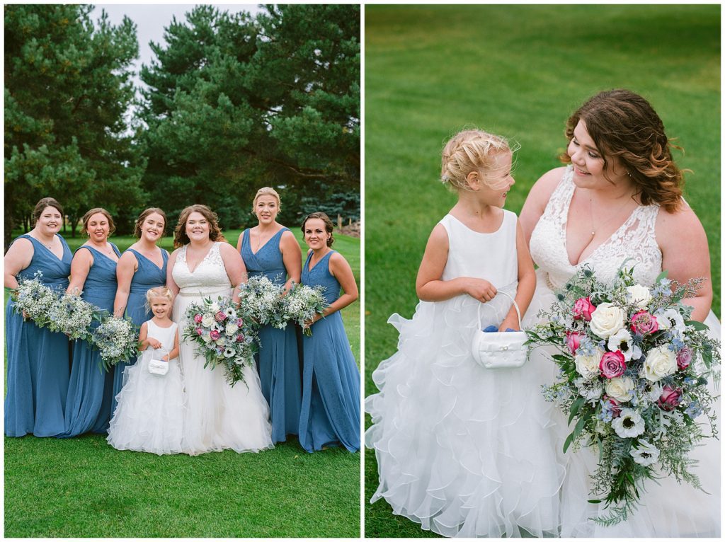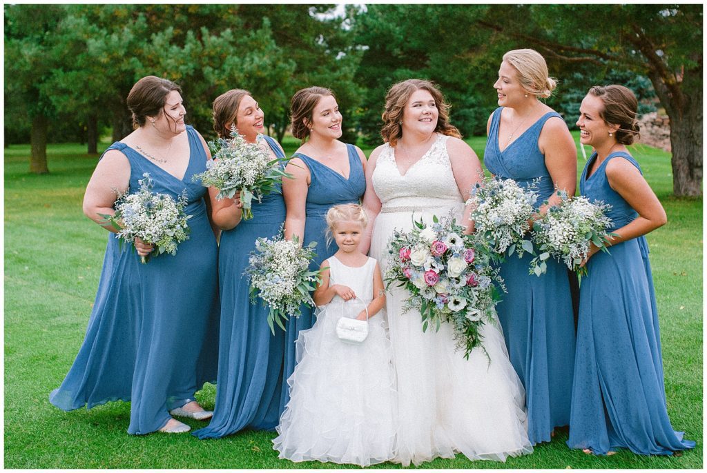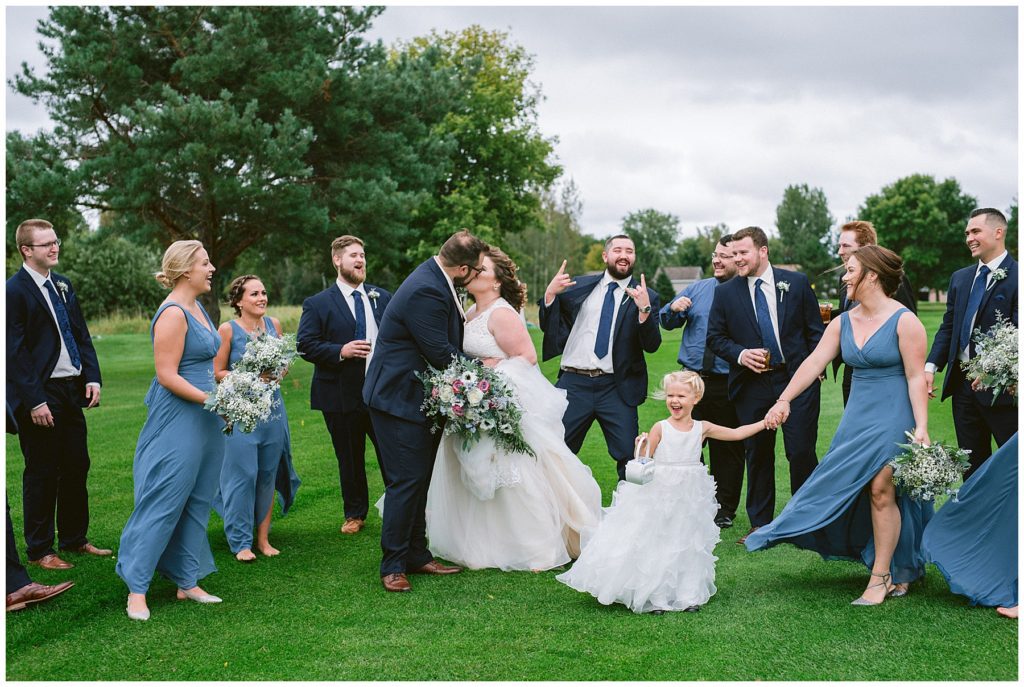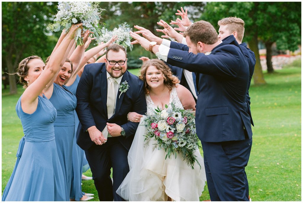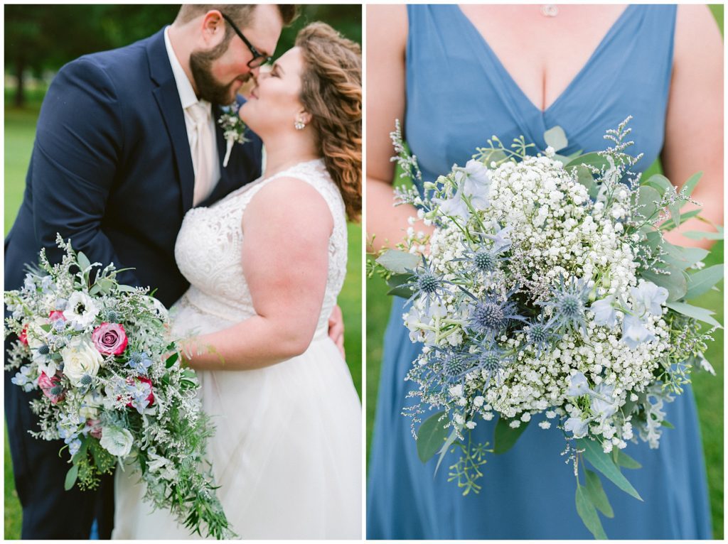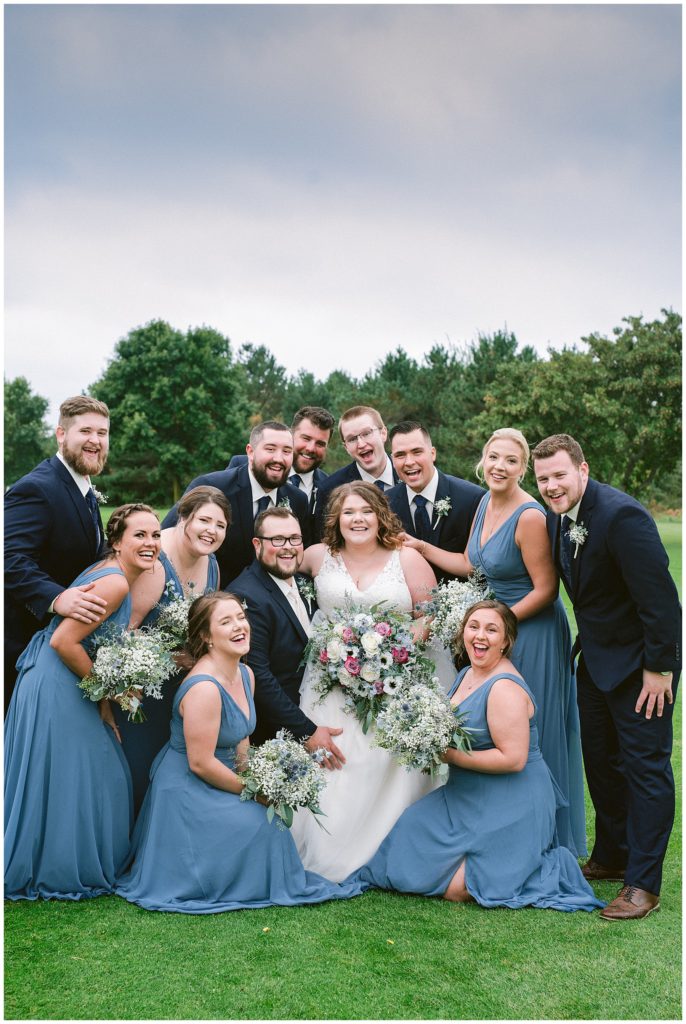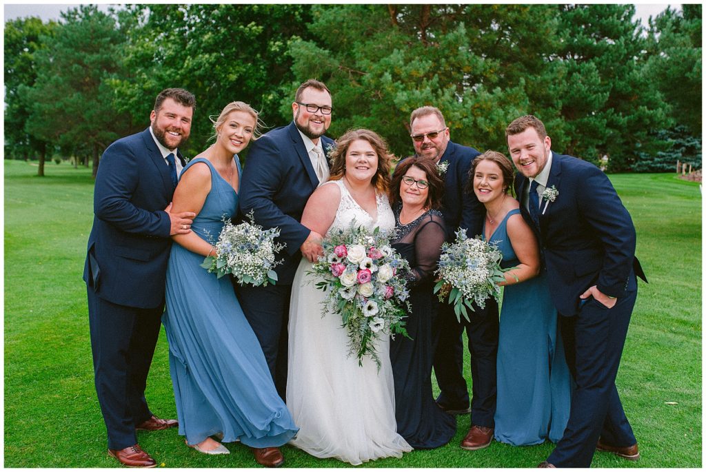 Anne’s beautiful lace wedding dress from the Wedding Shoppe paired perfectly with the periwinkle dresses that the bridesmaids wore. The baby’s breath and greenery bouquets popped when paired with the navy suits that the men wore.