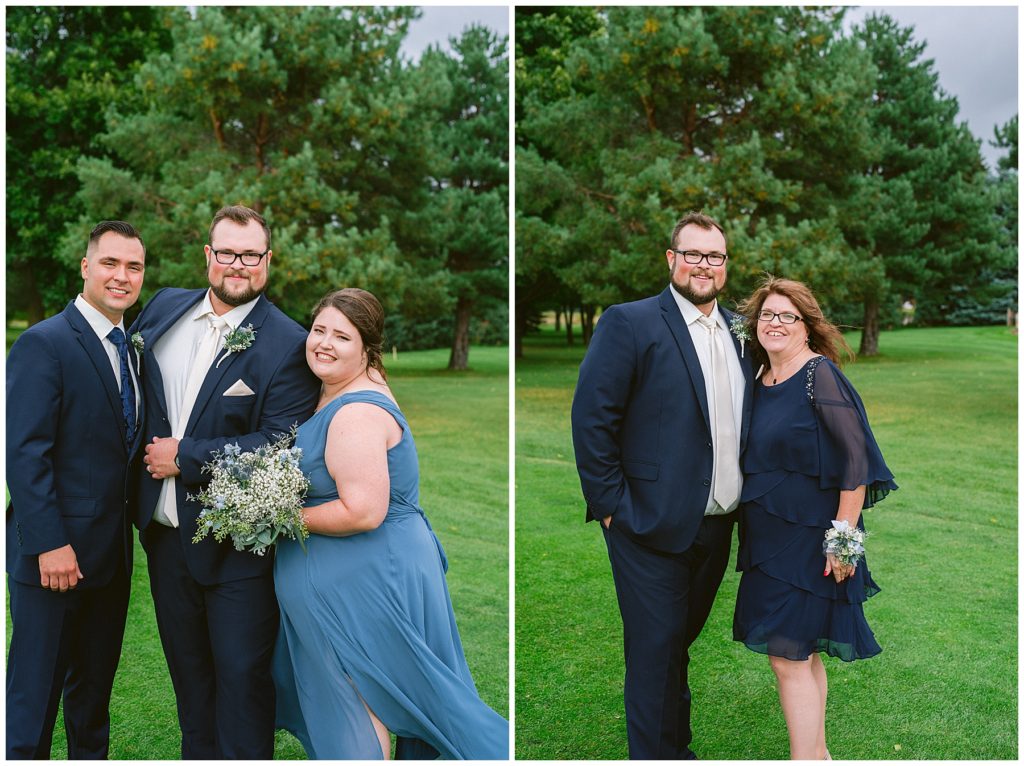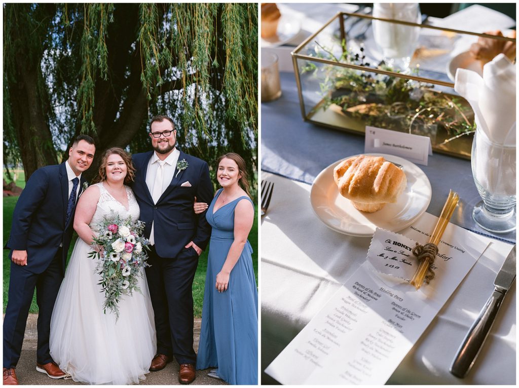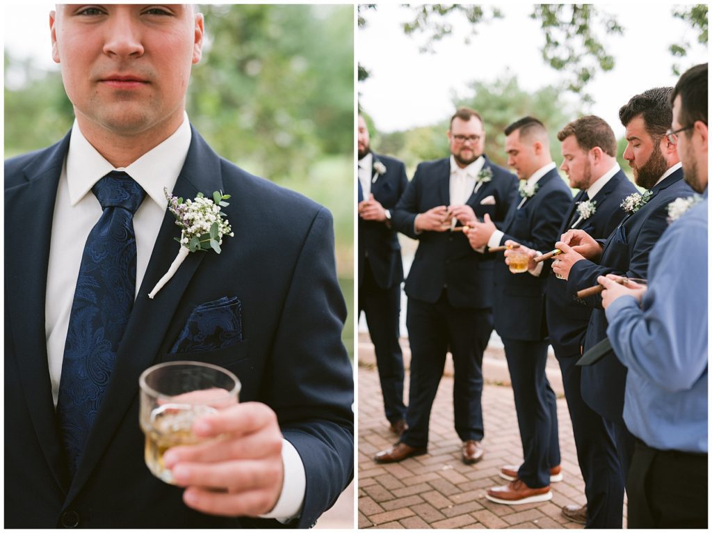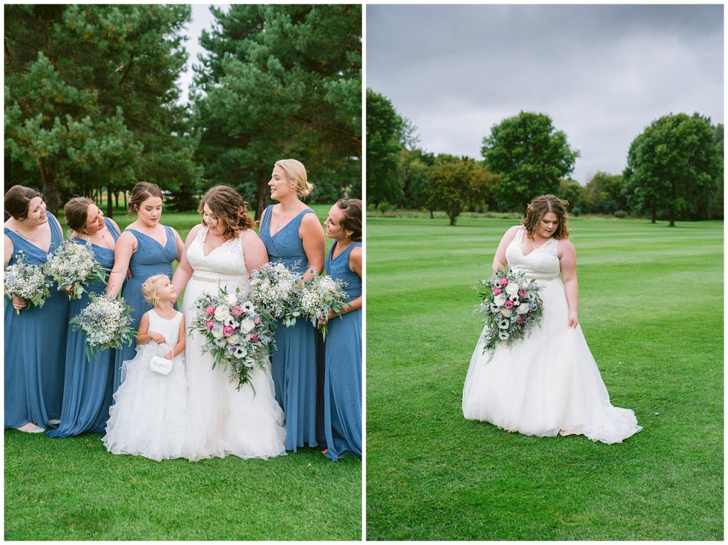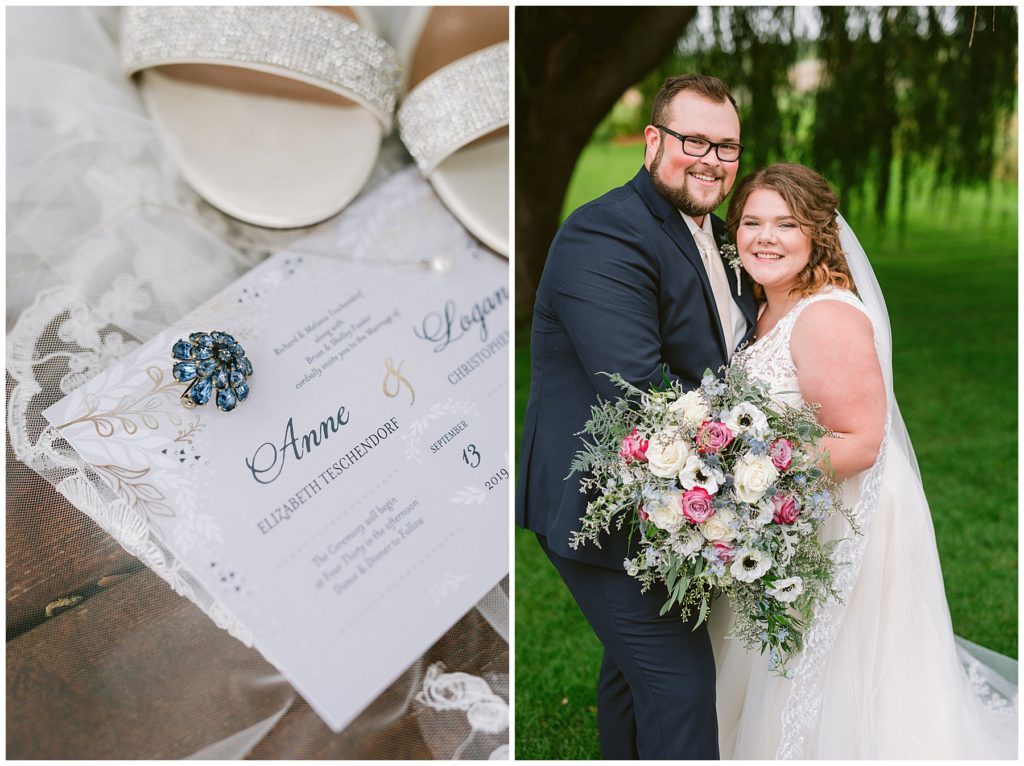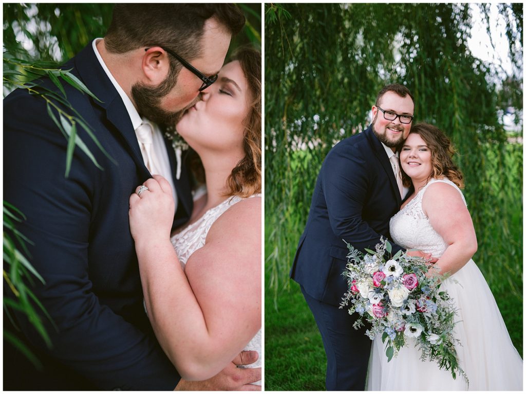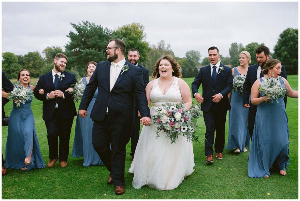 Anne’s beautiful lace wedding dress from the Wedding Shoppe paired perfectly with the periwinkle dresses that the bridesmaids wore. The baby’s breath and greenery bouquets popped when paired with the navy suits that the men wore.