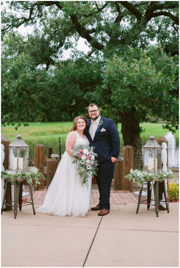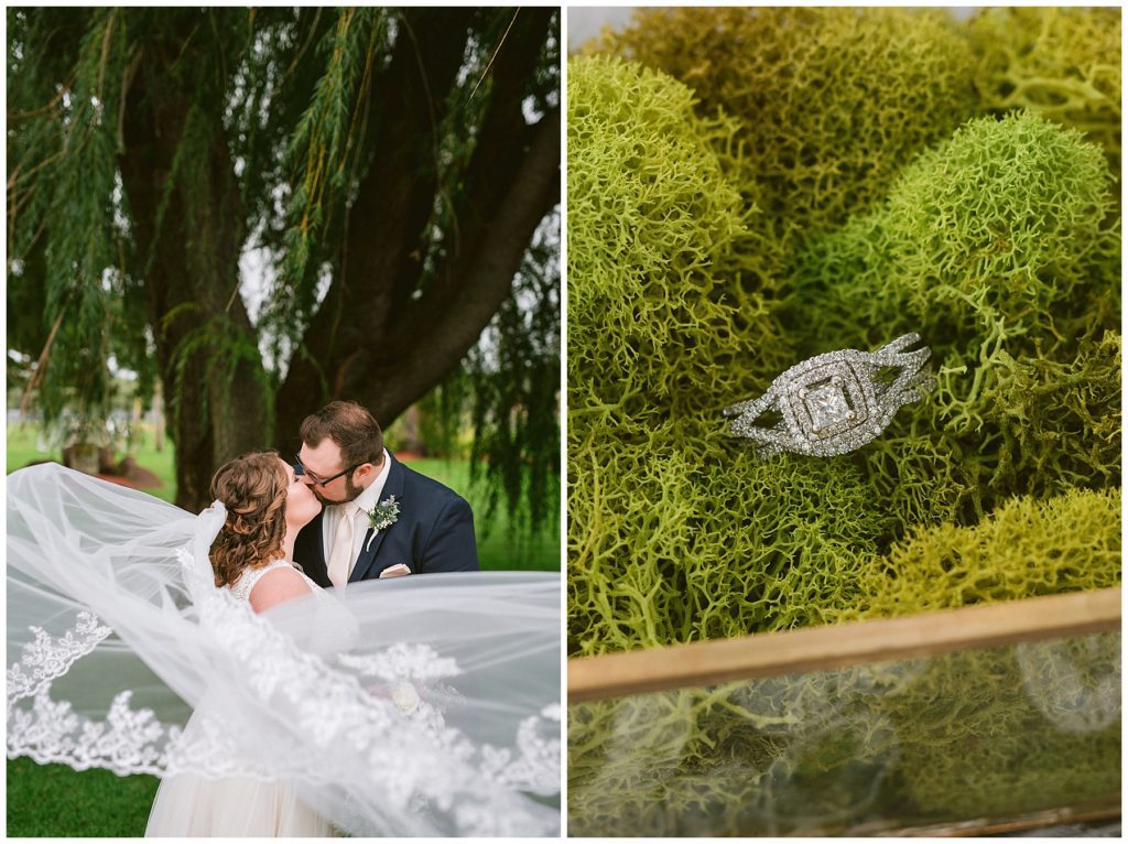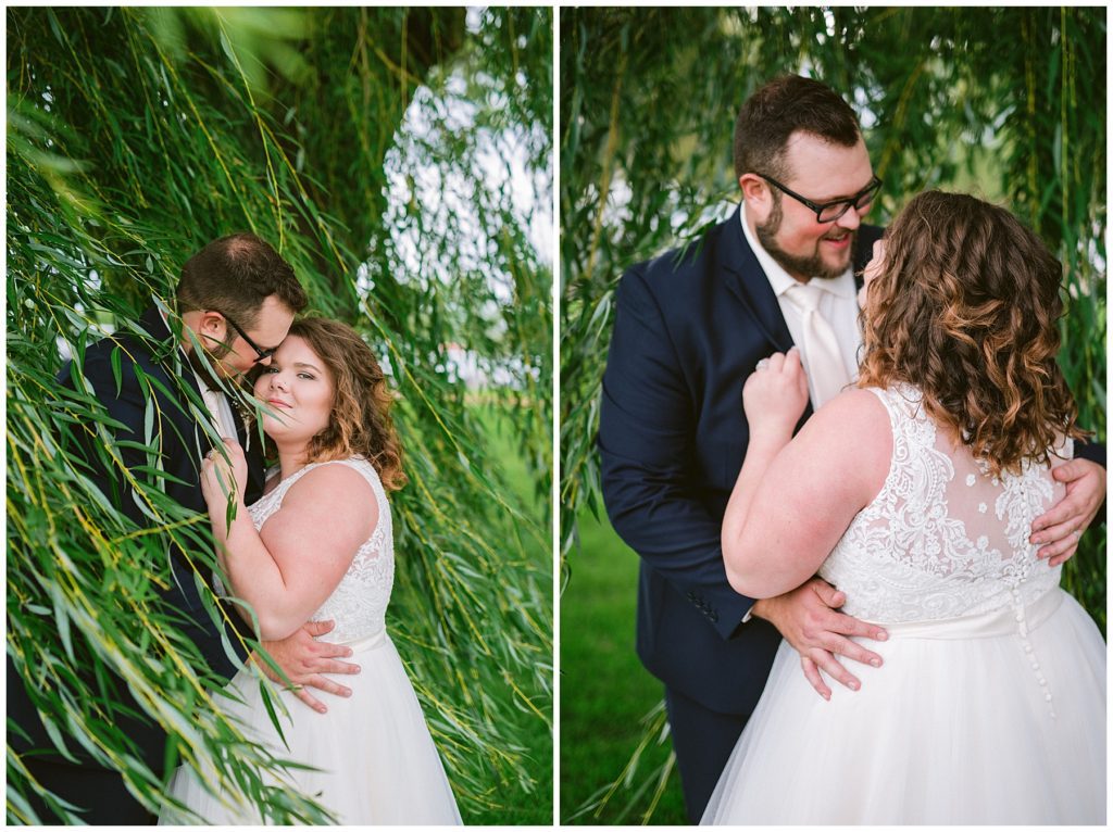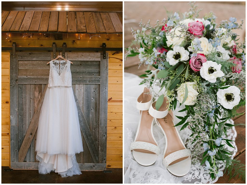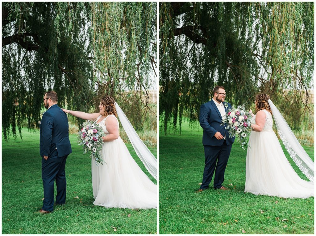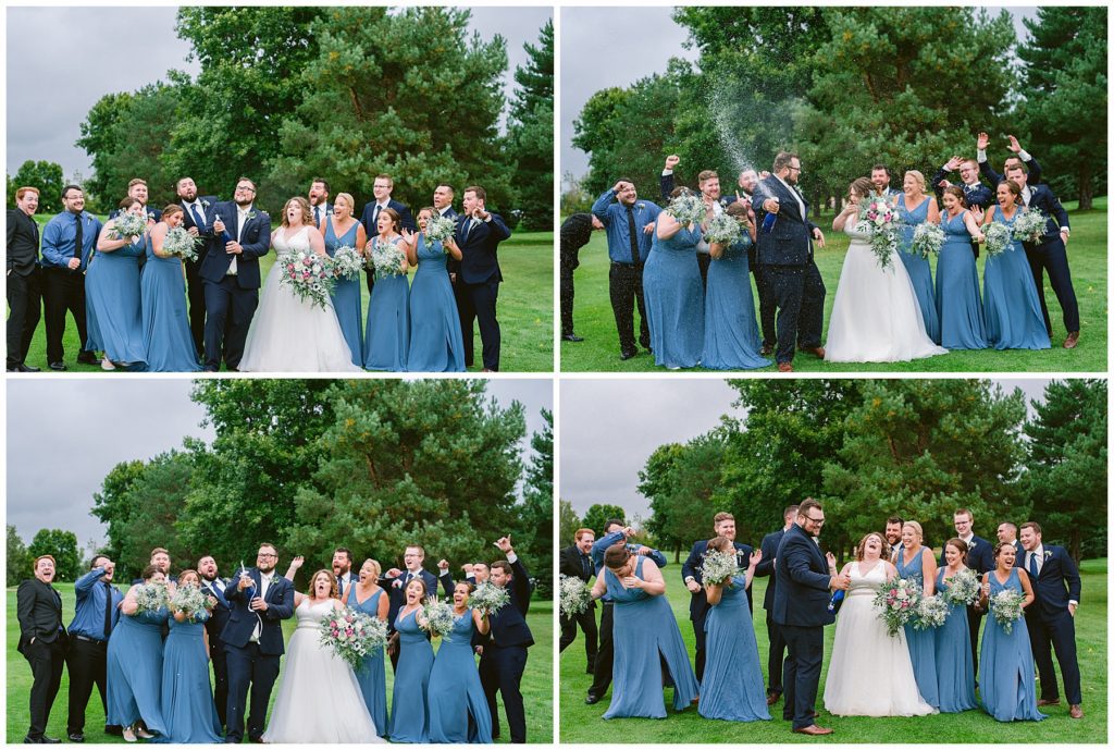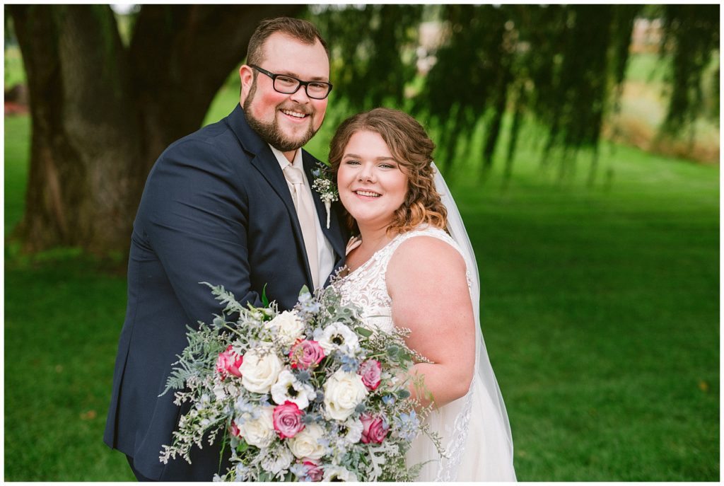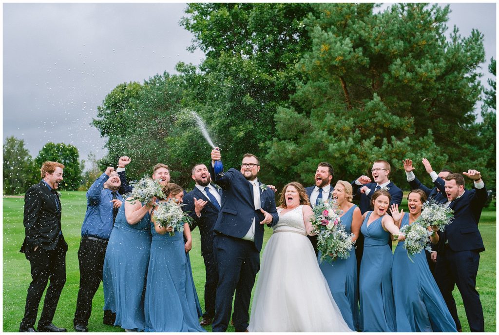 Anne’s beautiful lace wedding dress from the Wedding Shoppe paired perfectly with the periwinkle dresses that the bridesmaids wore. The baby’s breath and greenery bouquets popped when paired with the navy suits that the men wore.