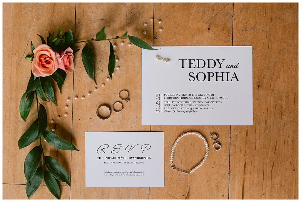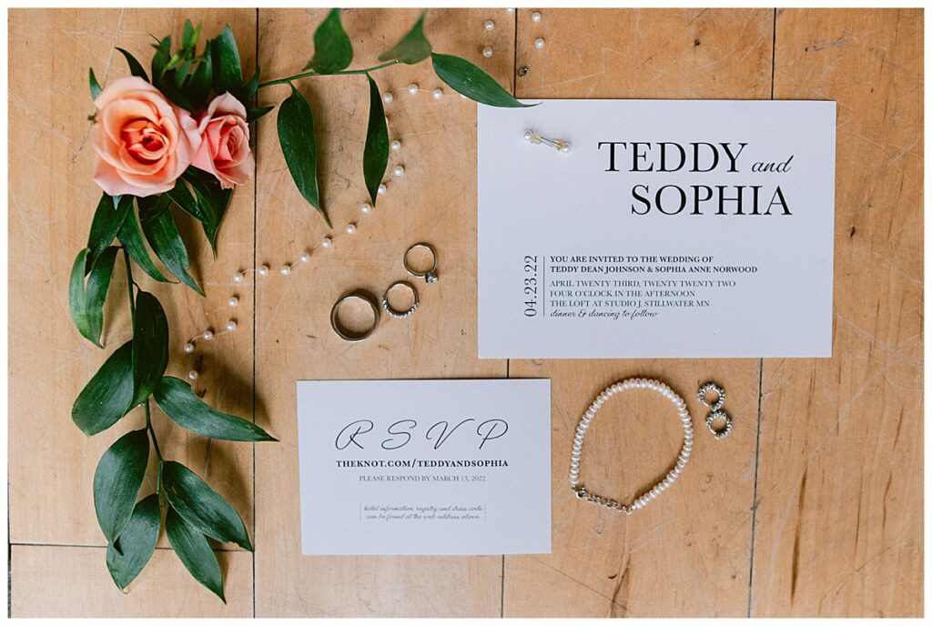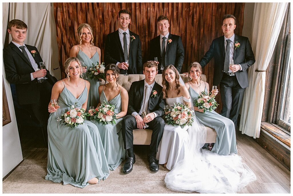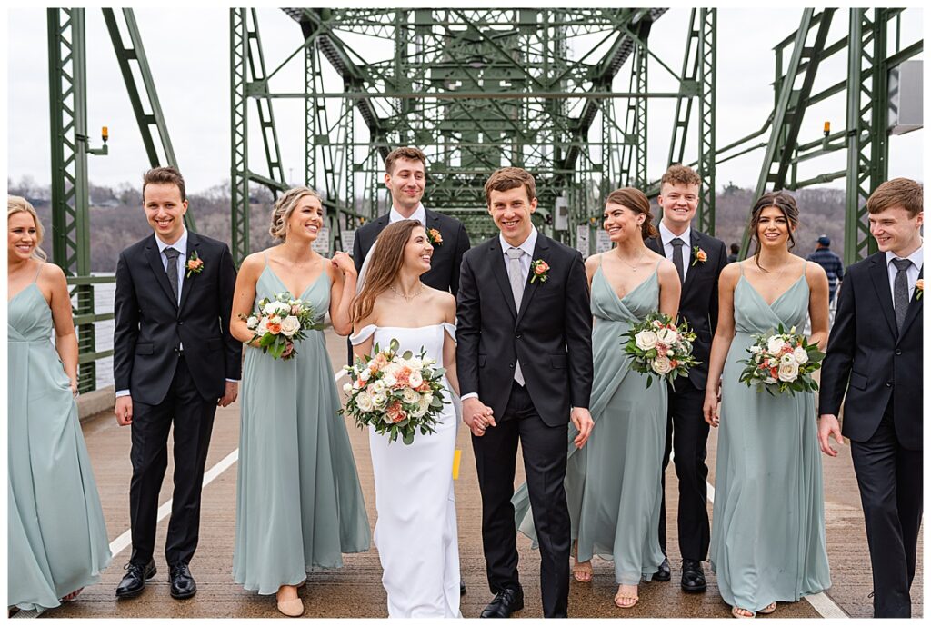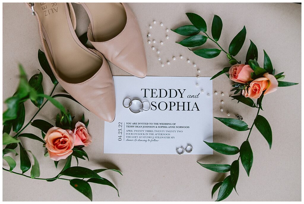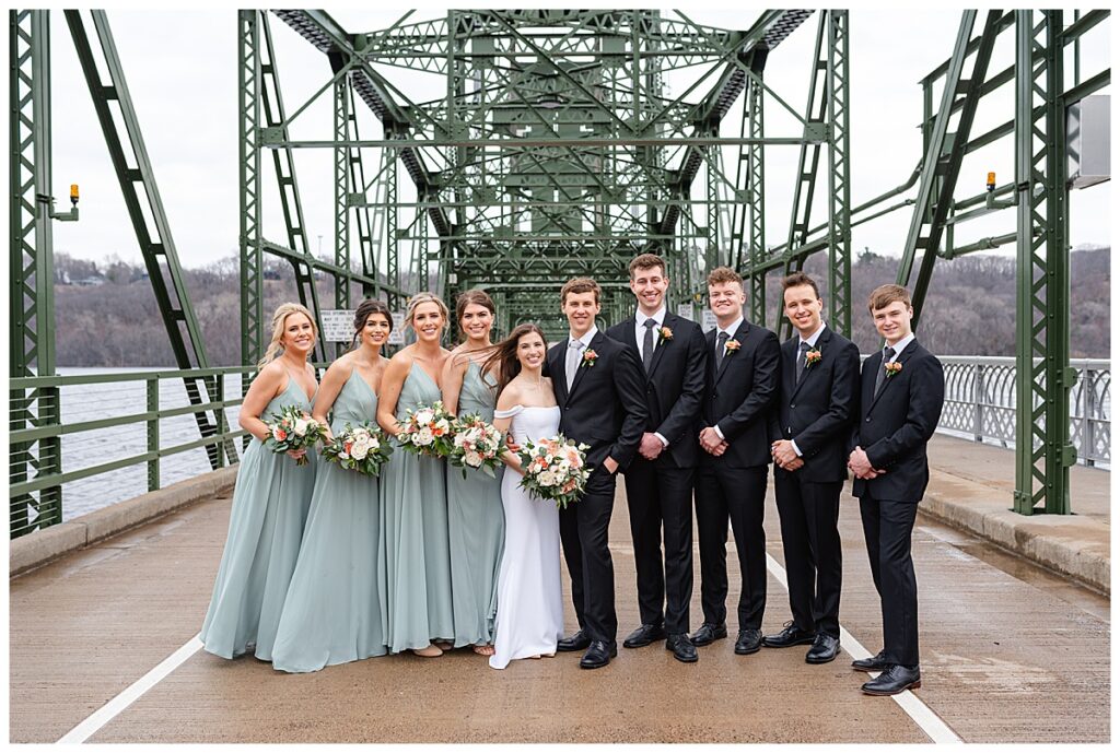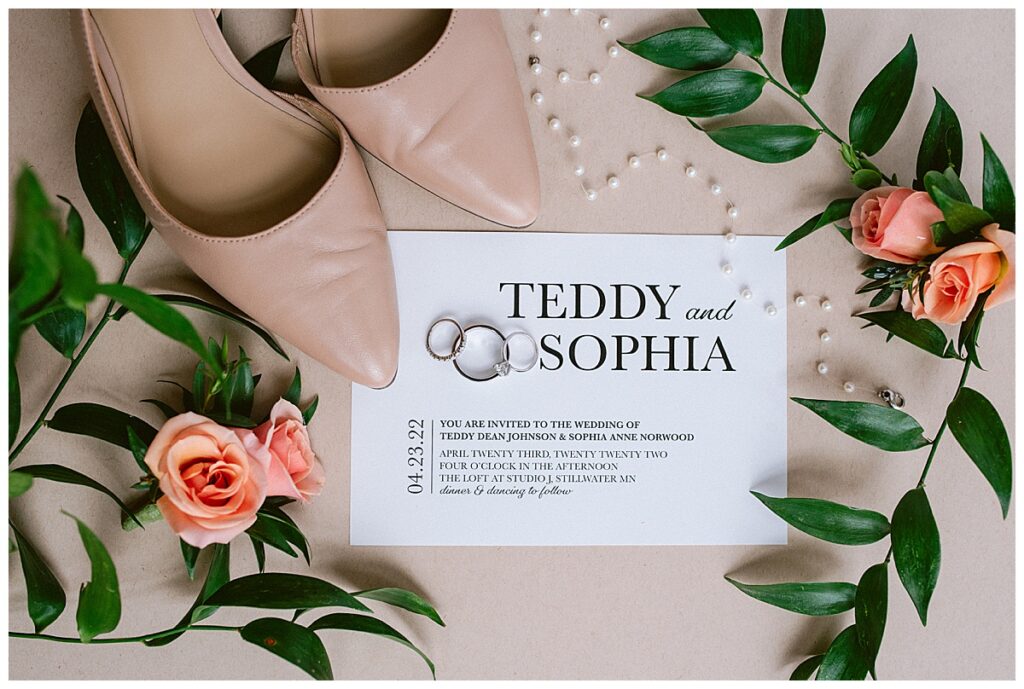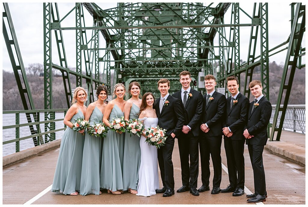 Having friends and family together again was so exciting for Sophia and Teddy and they were so happy to finally be able to celebrate with them. The Loft at Studio J was a perfect location for their April wedding day. This historic industrial building in the beautiful city of Stillwater was a perfect location for both indoor and outdoor photos. Sophia’s lace dress from A&Be Bridal was even more beautiful when paired with the sage bridesmaid dresses from Birdy Grey. Lakeside floral created the most incredible bouquets which held white and melon roses and a variety of greens . Around Sophia’s bouquet, a small pendant from her great grandmother who immigrated to America from Ireland was perfectly placed. Teddy and his groomsmen sported classic black suits with black ties from Atmosfere. Each beautifully decorated table was numbered with a photo of Sophia and Teddy at the age in which the table number was. A blank sheet of paper was also placed at each table so that together guests could write a letter for Sophia and Teddy to open at their future anniversaries. Bella Vida served a tasty meal while Cakealicious provided an incredible cake and sweet cupcakes for the guests. Joe from Day One DJ welcomed the couple and guests to the dance floor and the party began and did not stop until the night was over and there was even a guest song sung by Teddy’s uncle.
