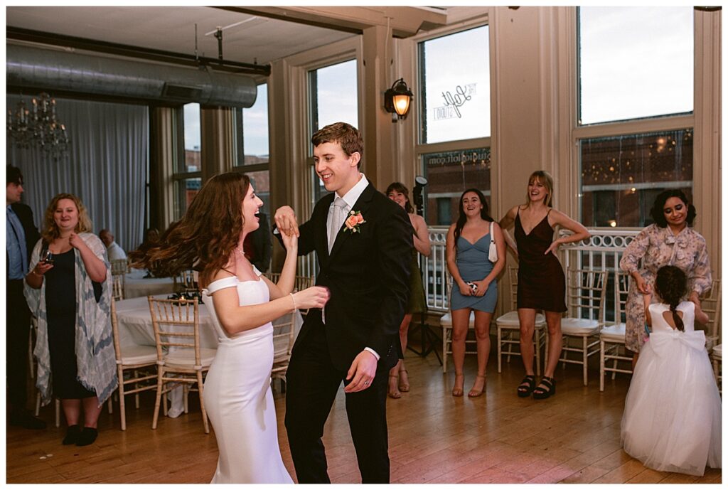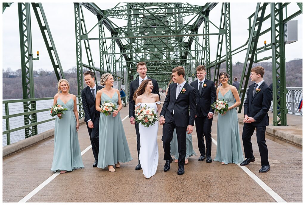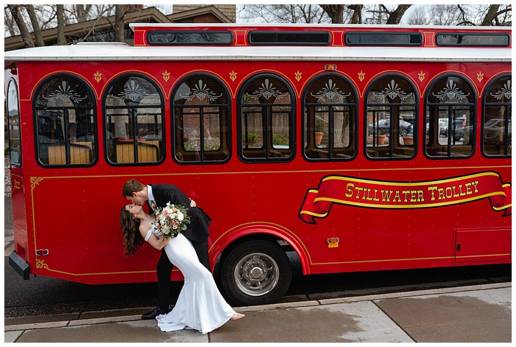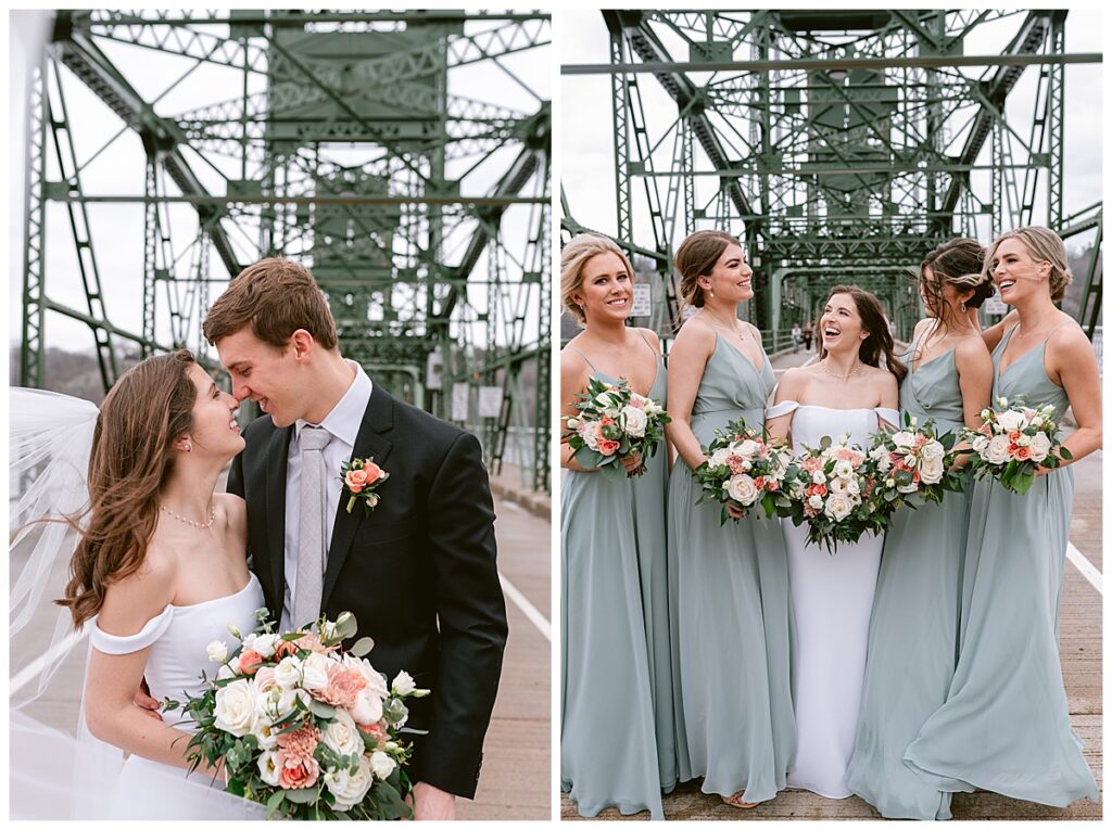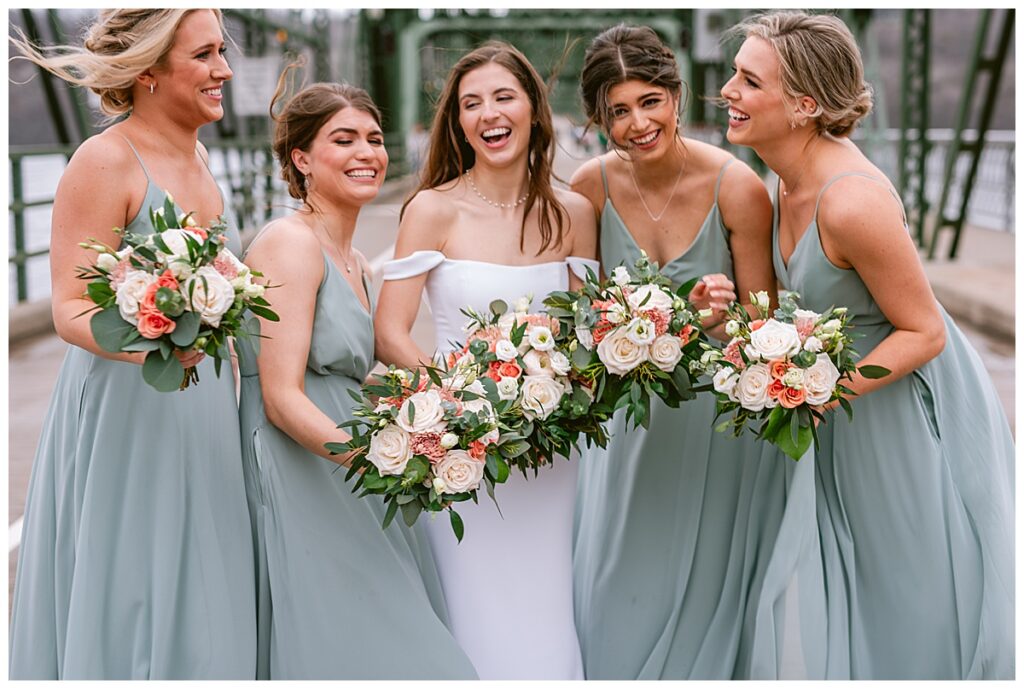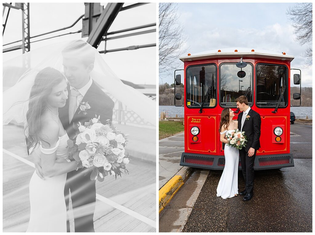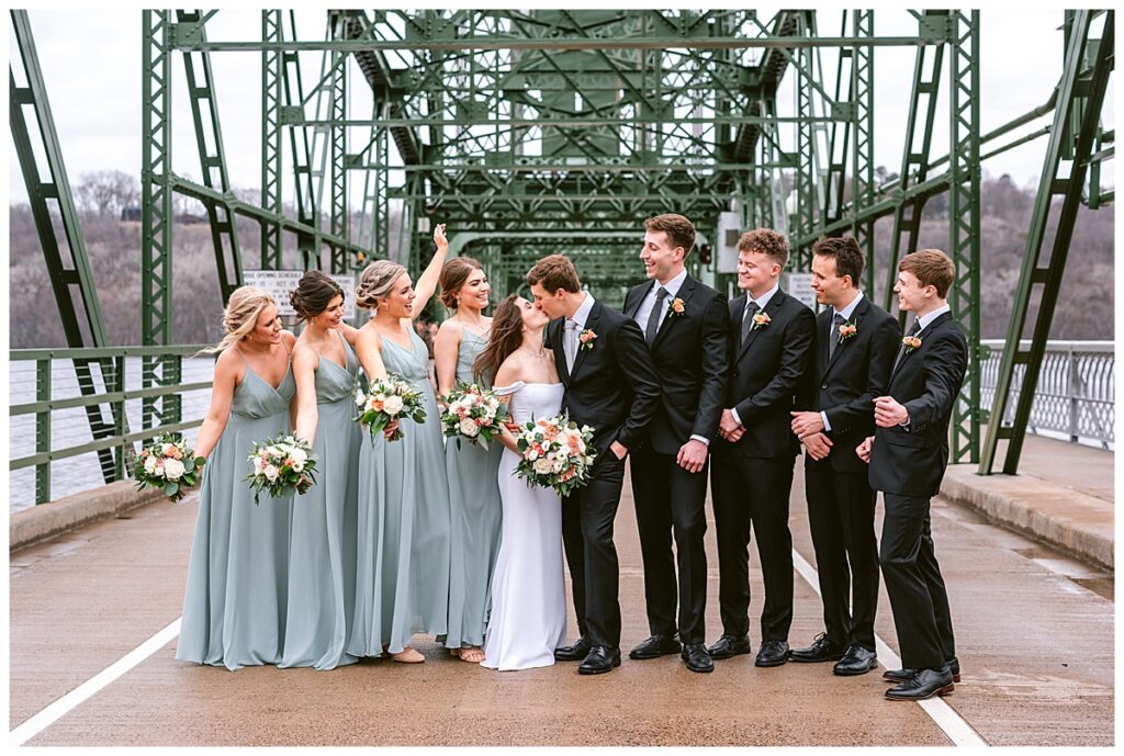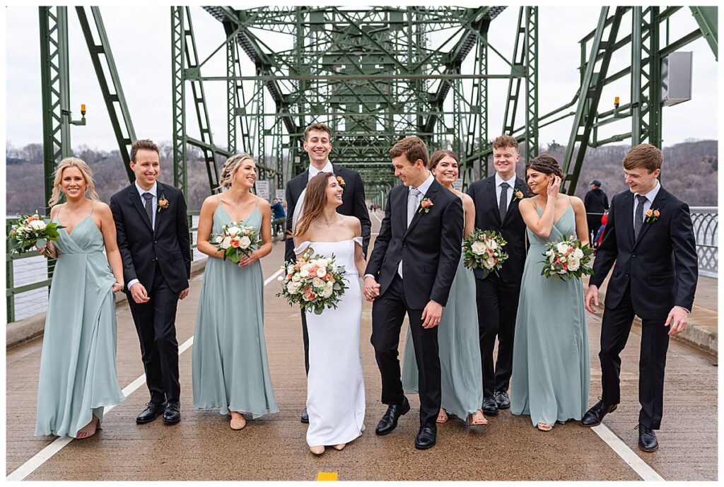Having friends and family together again was so exciting for Sophia and Teddy and they were so happy to finally be able to celebrate with them. The Loft at Studio J was a perfect location for their April wedding day. This historic industrial building in the beautiful city of Stillwater was a perfect location for both indoor and outdoor photos. Sophia’s lace dress from A&Be Bridal was even more beautiful when paired with the sage bridesmaid dresses from Birdy Grey. Lakeside floral created the most incredible bouquets which held white and melon roses and a variety of greens . Around Sophia’s bouquet, a small pendant from her great grandmother who immigrated to America from Ireland was perfectly placed. Teddy and his groomsmen sported classic black suits with black ties from Atmosfere. Each beautifully decorated table was numbered with a photo of Sophia and Teddy at the age in which the table number was. A blank sheet of paper was also placed at each table so that together guests could write a letter for Sophia and Teddy to open at their future anniversaries. Bella Vida served a tasty meal while Cakealicious provided an incredible cake and sweet cupcakes for the guests. Joe from Day One DJ welcomed the couple and guests to the dance floor and the party began and did not stop until the night was over and there was even a guest song sung by Teddy’s uncle.