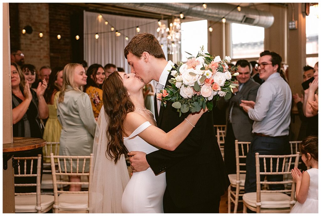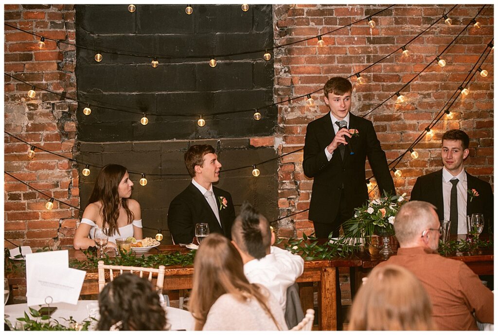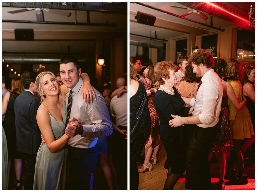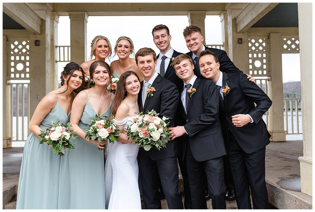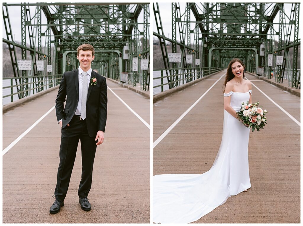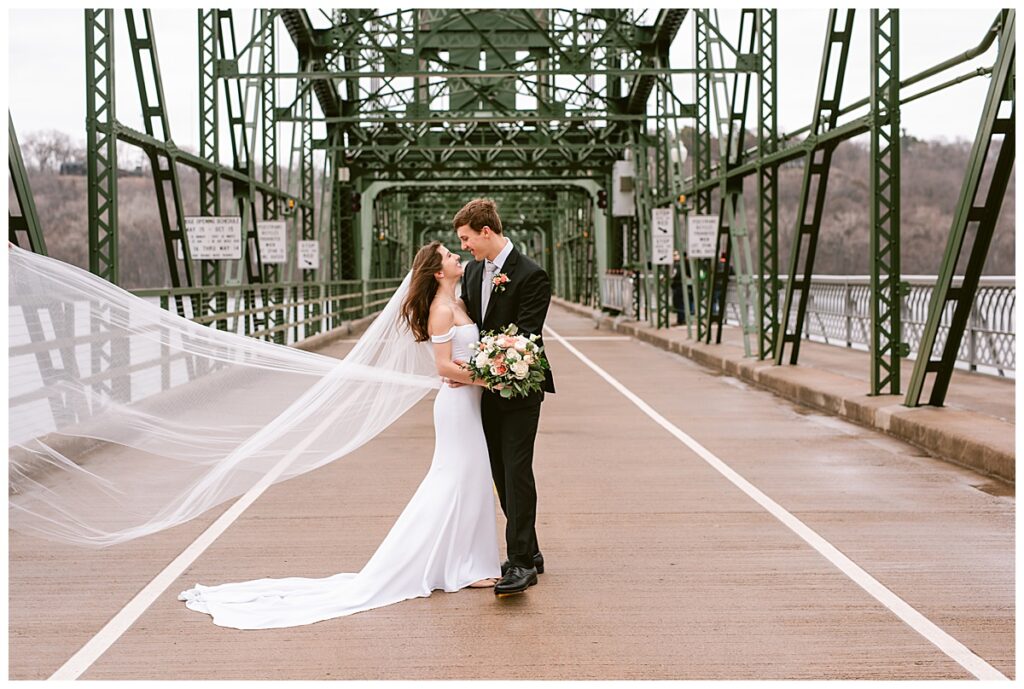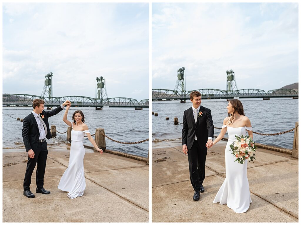 Having friends and family together again was so exciting for Sophia and Teddy and they were so happy to finally be able to celebrate with them. The Loft at Studio J was a perfect location for their April wedding day. This historic industrial building in the beautiful city of Stillwater was a perfect location for both indoor and outdoor photos. Sophia’s lace dress from A&Be Bridal was even more beautiful when paired with the sage bridesmaid dresses from Birdy Grey. Lakeside floral created the most incredible bouquets which held white and melon roses and a variety of greens . Around Sophia’s bouquet, a small pendant from her great grandmother who immigrated to America from Ireland was perfectly placed. Teddy and his groomsmen sported classic black suits with black ties from Atmosfere. Each beautifully decorated table was numbered with a photo of Sophia and Teddy at the age in which the table number was. A blank sheet of paper was also placed at each table so that together guests could write a letter for Sophia and Teddy to open at their future anniversaries. Bella Vida served a tasty meal while Cakealicious provided an incredible cake and sweet cupcakes for the guests. Joe from Day One DJ welcomed the couple and guests to the dance floor and the party began and did not stop until the night was over and there was even a guest song sung by Teddy’s uncle.