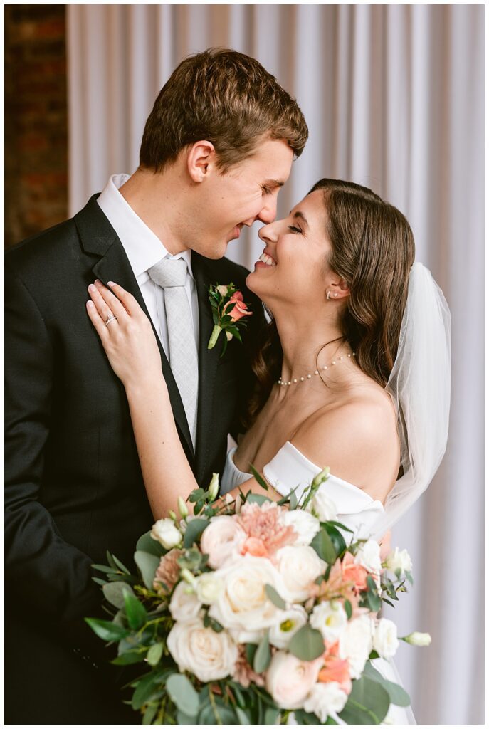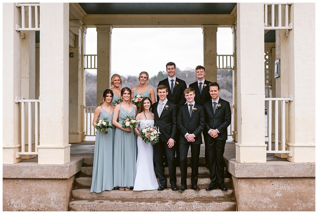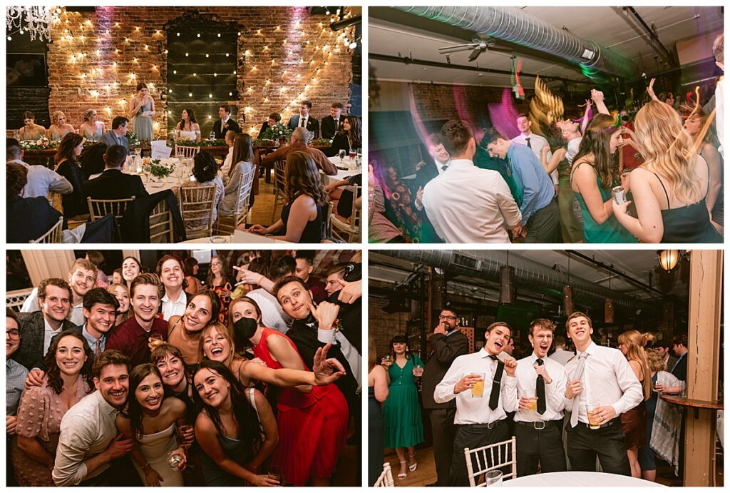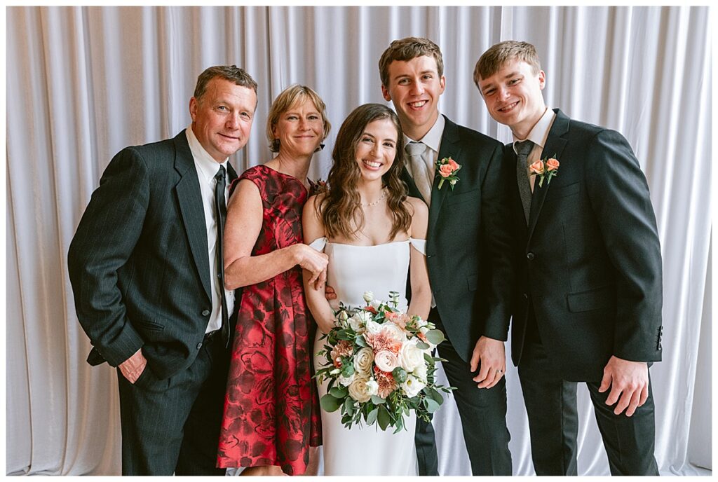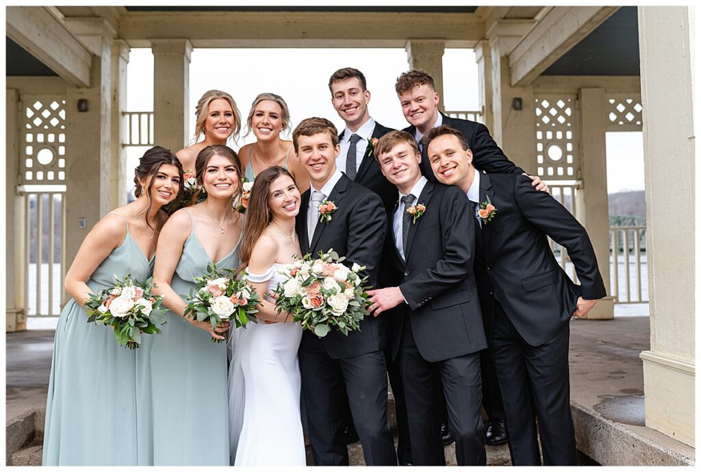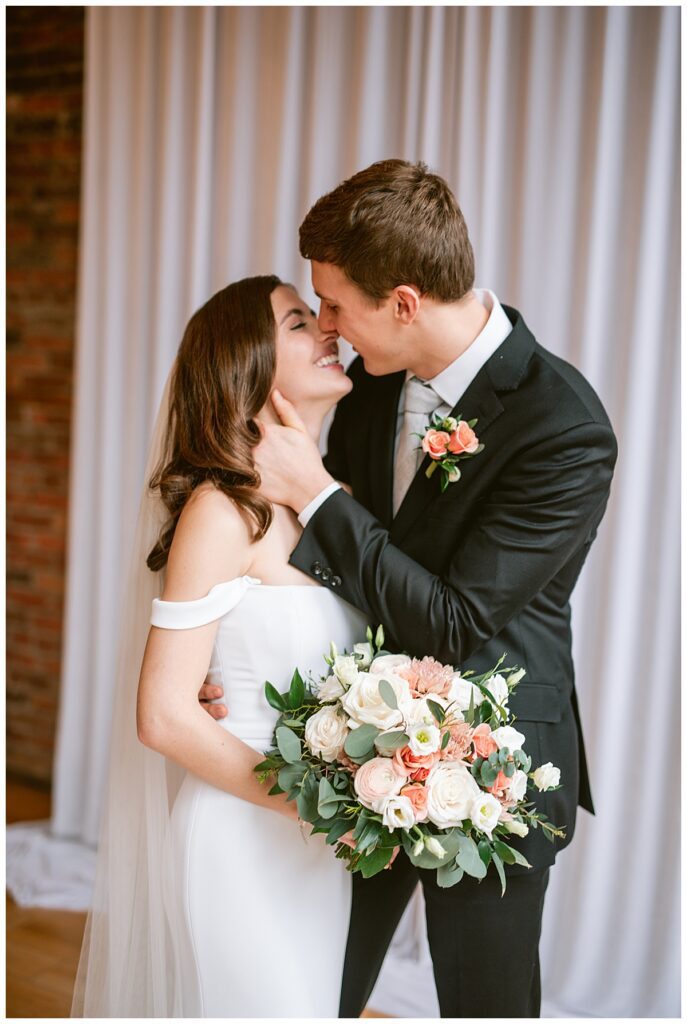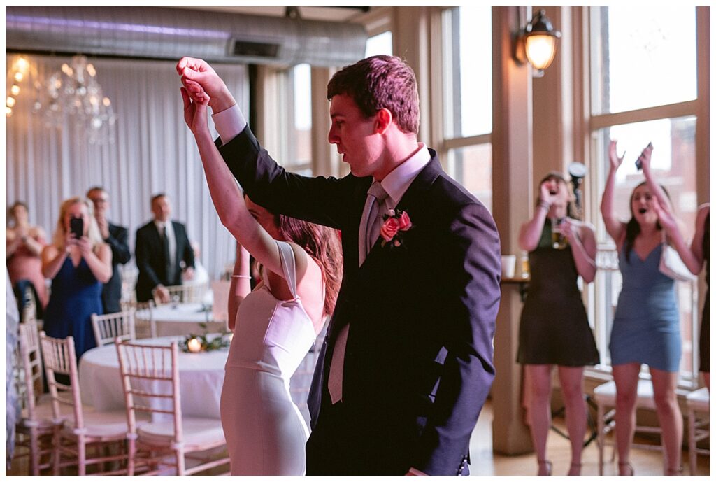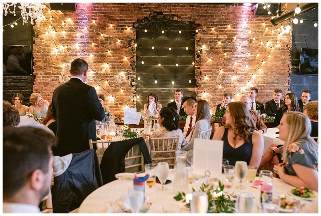 Having friends and family together again was so exciting for Sophia and Teddy and they were so happy to finally be able to celebrate with them. The Loft at Studio J was a perfect location for their April wedding day. This historic industrial building in the beautiful city of Stillwater was a perfect location for both indoor and outdoor photos. Sophia’s lace dress from A&Be Bridal was even more beautiful when paired with the sage bridesmaid dresses from Birdy Grey. Lakeside floral created the most incredible bouquets which held white and melon roses and a variety of greens . Around Sophia’s bouquet, a small pendant from her great grandmother who immigrated to America from Ireland was perfectly placed. Teddy and his groomsmen sported classic black suits with black ties from Atmosfere. Each beautifully decorated table was numbered with a photo of Sophia and Teddy at the age in which the table number was. A blank sheet of paper was also placed at each table so that together guests could write a letter for Sophia and Teddy to open at their future anniversaries. Bella Vida served a tasty meal while Cakealicious provided an incredible cake and sweet cupcakes for the guests. Joe from Day One DJ welcomed the couple and guests to the dance floor and the party began and did not stop until the night was over and there was even a guest song sung by Teddy’s uncle.