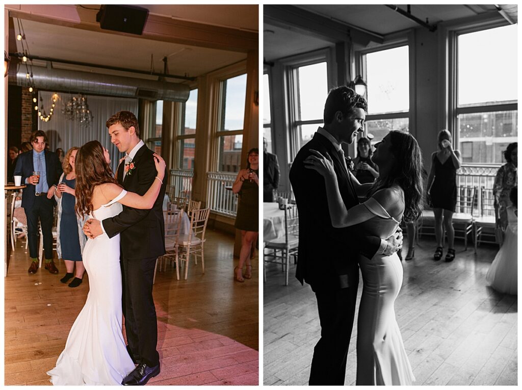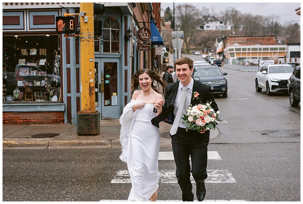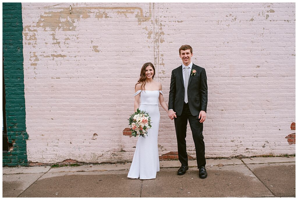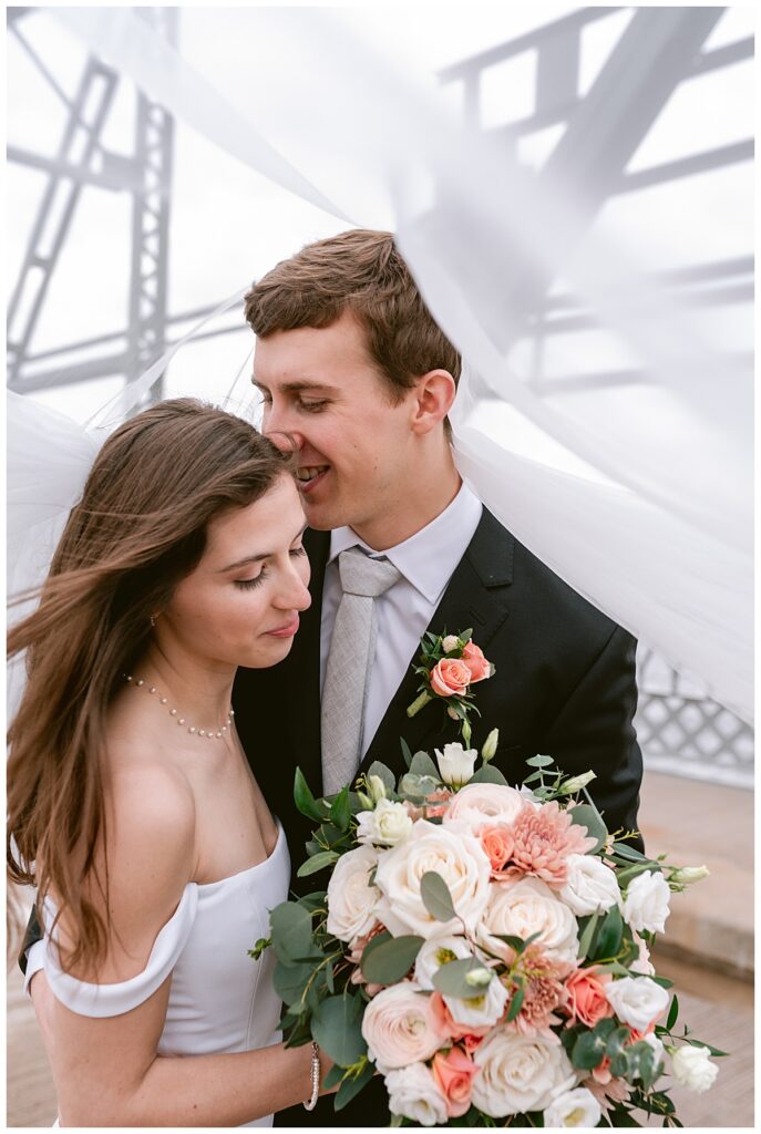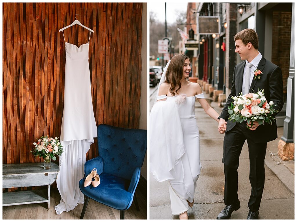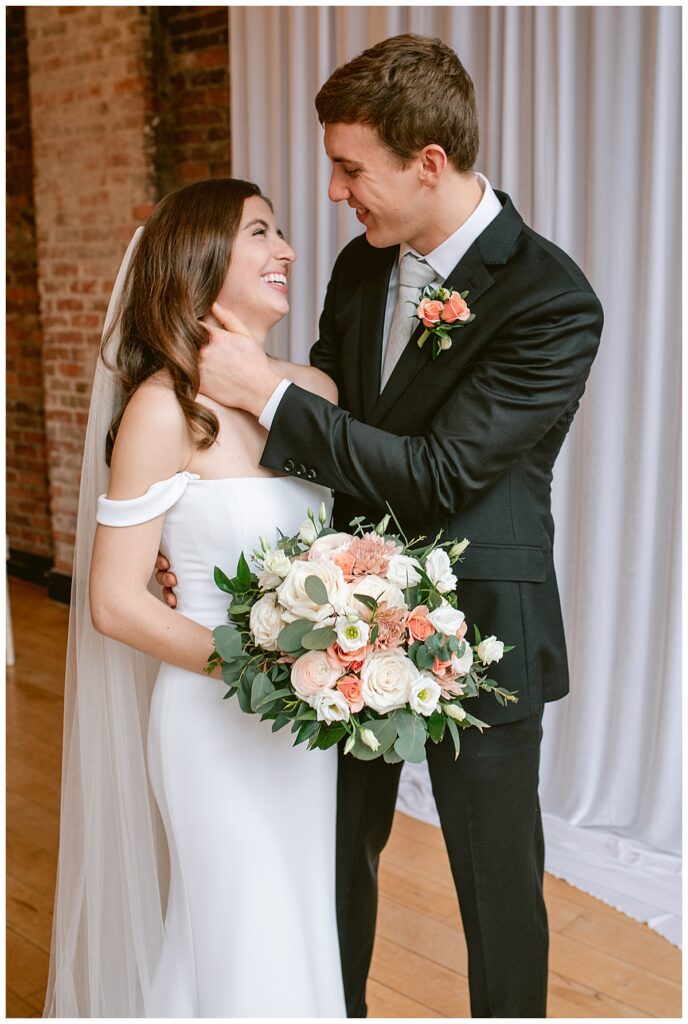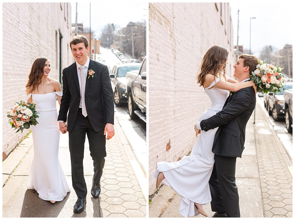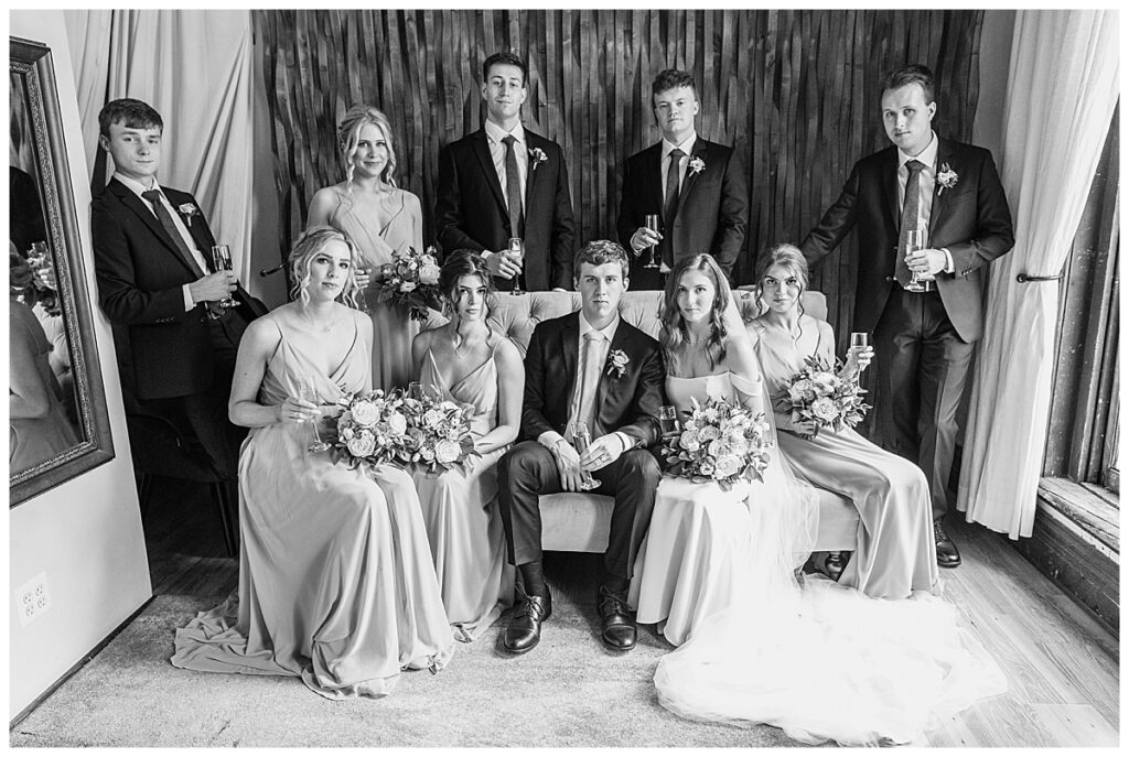 Having friends and family together again was so exciting for Sophia and Teddy and they were so happy to finally be able to celebrate with them. The Loft at Studio J was a perfect location for their April wedding day. This historic industrial building in the beautiful city of Stillwater was a perfect location for both indoor and outdoor photos. Sophia’s lace dress from A&Be Bridal was even more beautiful when paired with the sage bridesmaid dresses from Birdy Grey. Lakeside floral created the most incredible bouquets which held white and melon roses and a variety of greens . Around Sophia’s bouquet, a small pendant from her great grandmother who immigrated to America from Ireland was perfectly placed. Teddy and his groomsmen sported classic black suits with black ties from Atmosfere. Each beautifully decorated table was numbered with a photo of Sophia and Teddy at the age in which the table number was. A blank sheet of paper was also placed at each table so that together guests could write a letter for Sophia and Teddy to open at their future anniversaries. Bella Vida served a tasty meal while Cakealicious provided an incredible cake and sweet cupcakes for the guests. Joe from Day One DJ welcomed the couple and guests to the dance floor and the party began and did not stop until the night was over and there was even a guest song sung by Teddy’s uncle.