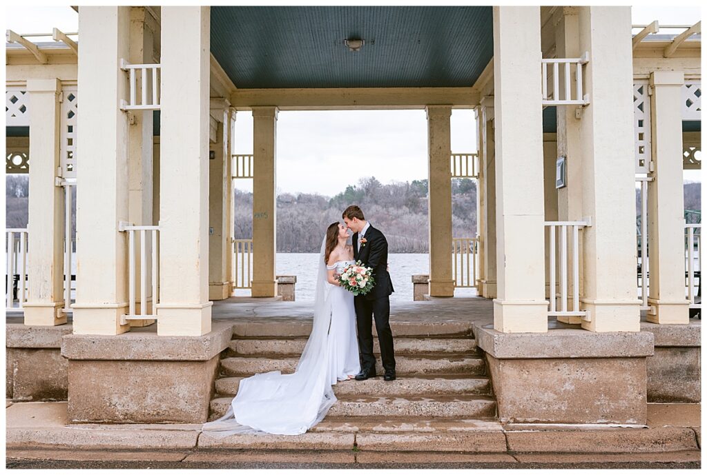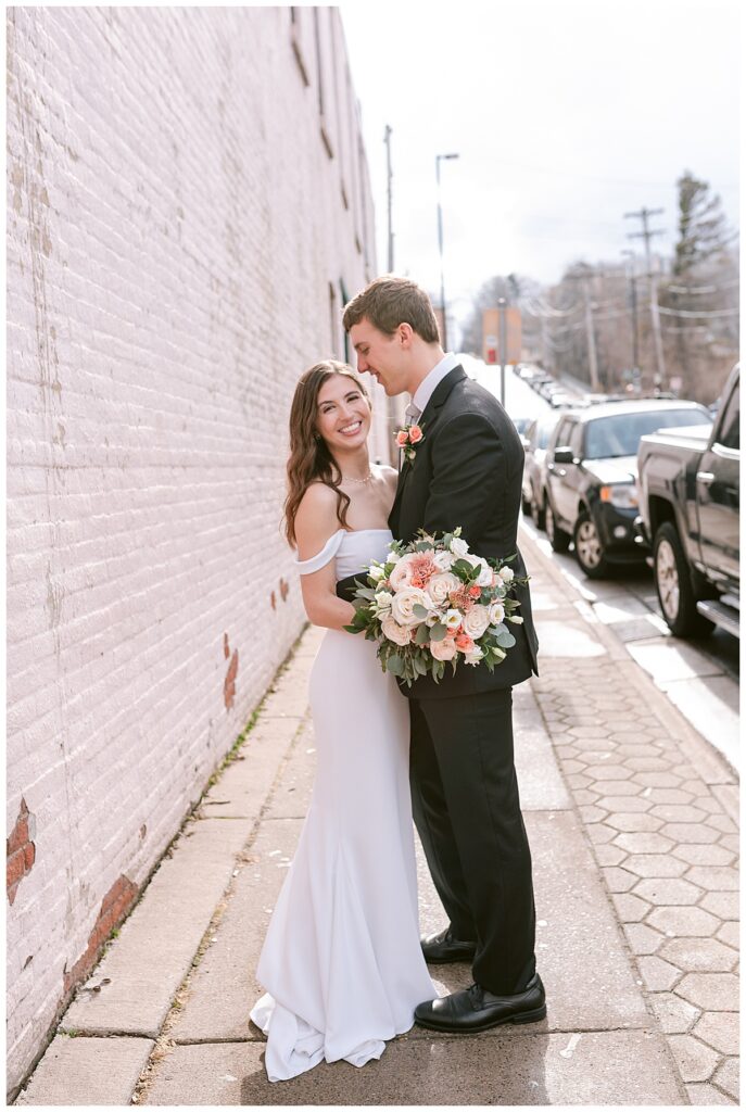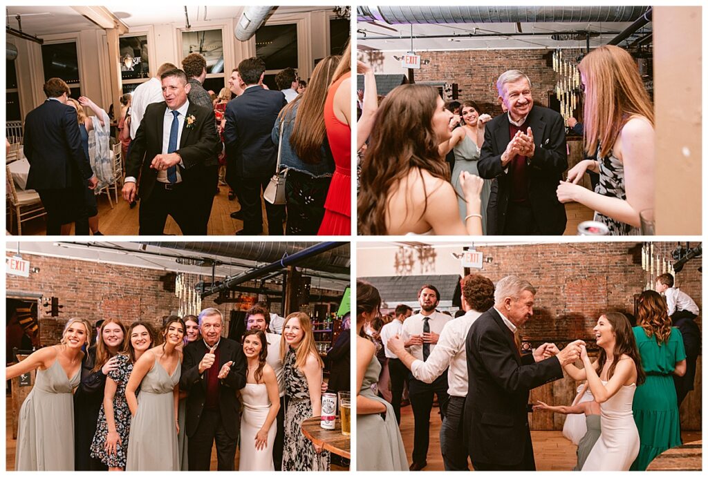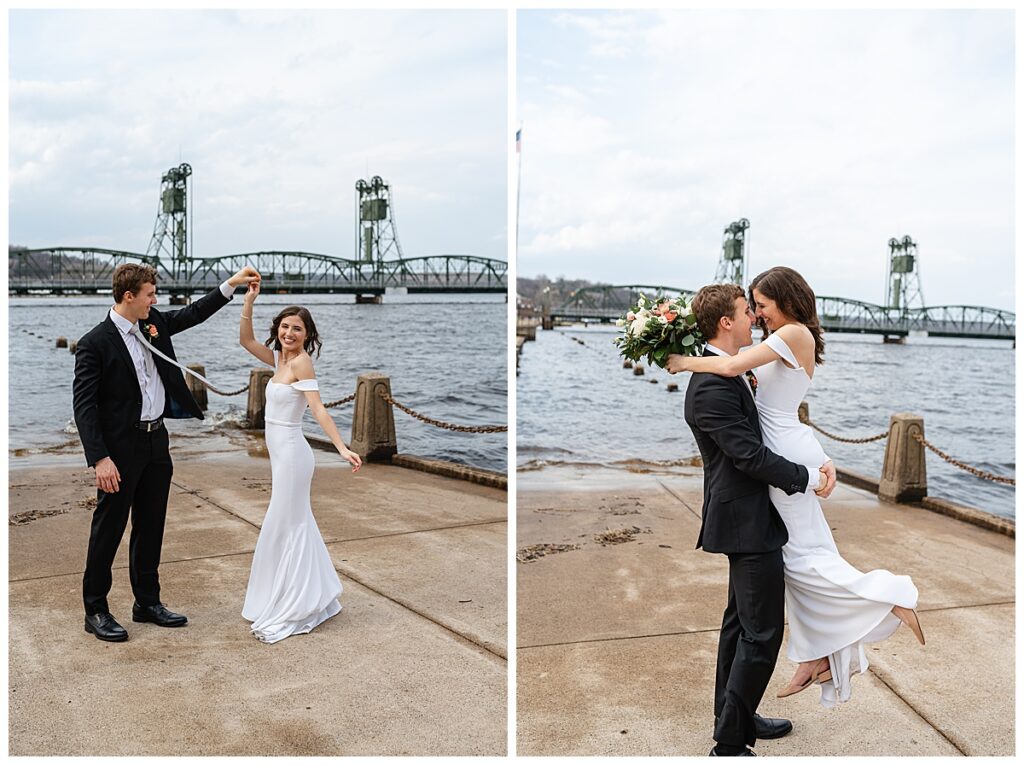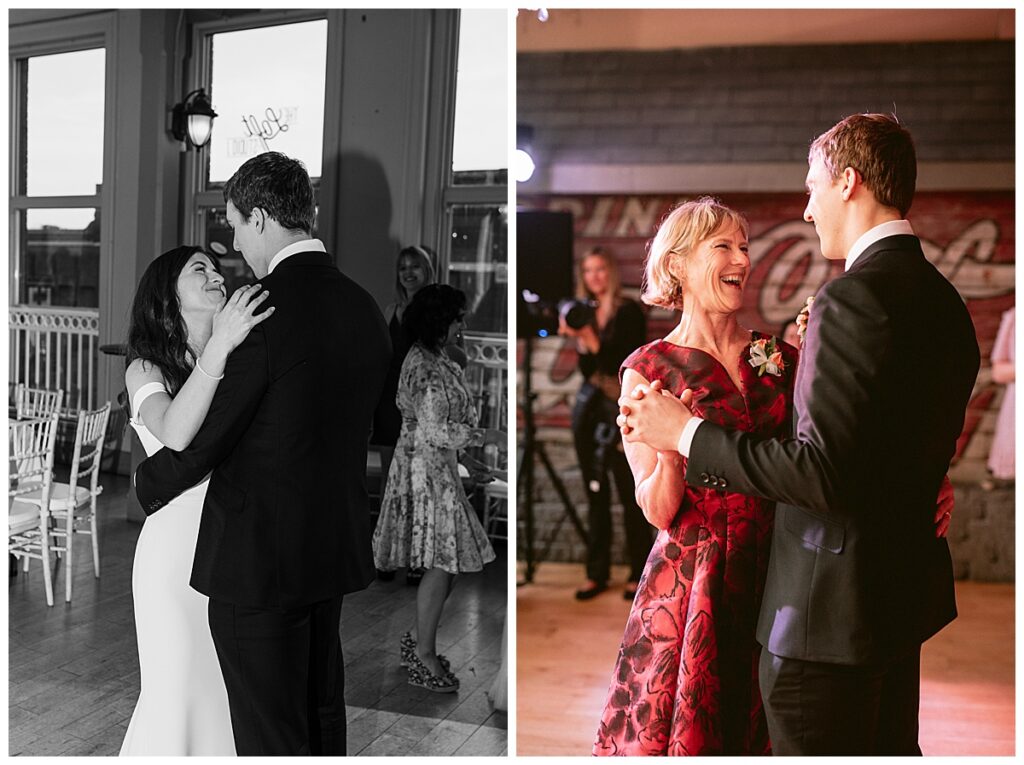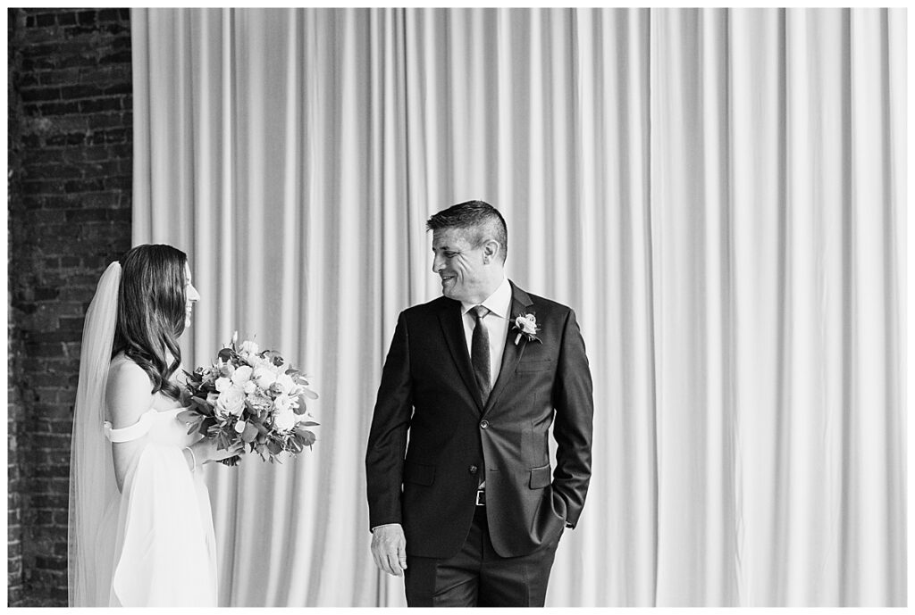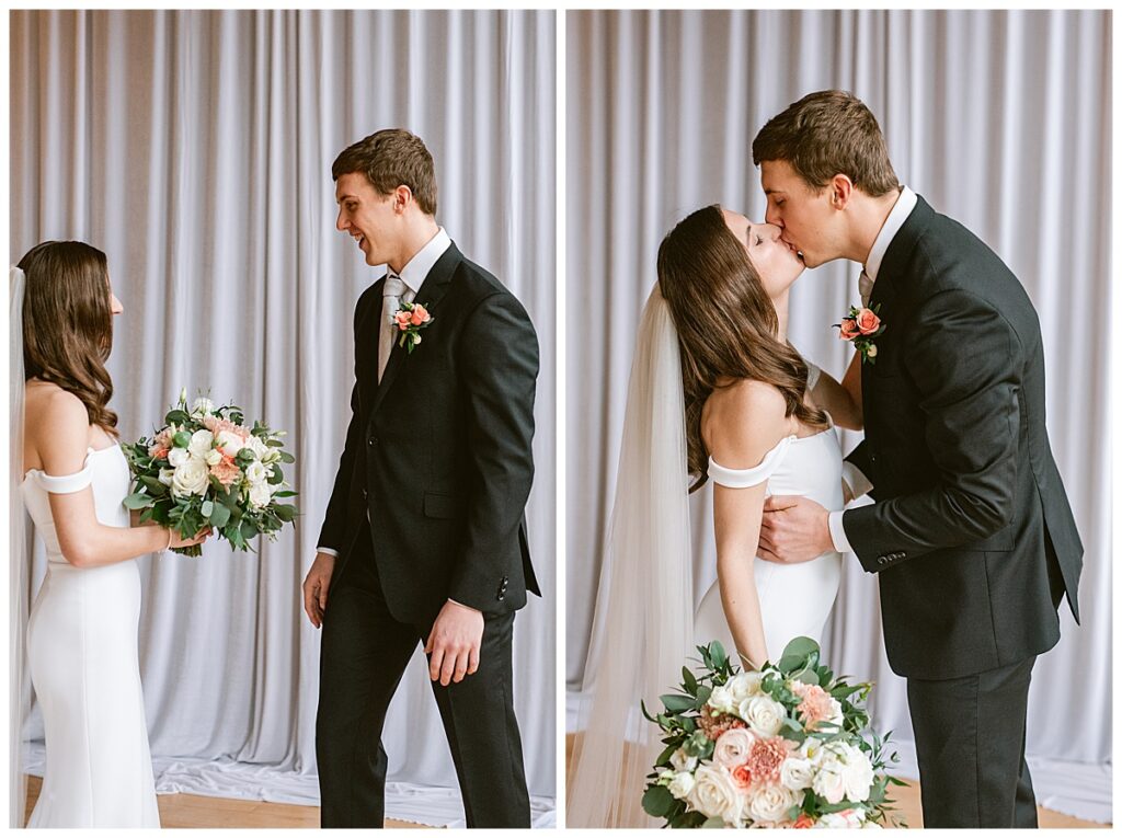 Having friends and family together again was so exciting for Sophia and Teddy and they were so happy to finally be able to celebrate with them. The Loft at Studio J was a perfect location for their April wedding day. This historic industrial building in the beautiful city of Stillwater was a perfect location for both indoor and outdoor photos. Sophia’s lace dress from A&Be Bridal was even more beautiful when paired with the sage bridesmaid dresses from Birdy Grey. Lakeside floral created the most incredible bouquets which held white and melon roses and a variety of greens . Around Sophia’s bouquet, a small pendant from her great grandmother who immigrated to America from Ireland was perfectly placed. Teddy and his groomsmen sported classic black suits with black ties from Atmosfere. Each beautifully decorated table was numbered with a photo of Sophia and Teddy at the age in which the table number was. A blank sheet of paper was also placed at each table so that together guests could write a letter for Sophia and Teddy to open at their future anniversaries. Bella Vida served a tasty meal while Cakealicious provided an incredible cake and sweet cupcakes for the guests. Joe from Day One DJ welcomed the couple and guests to the dance floor and the party began and did not stop until the night was over and there was even a guest song sung by Teddy’s uncle.