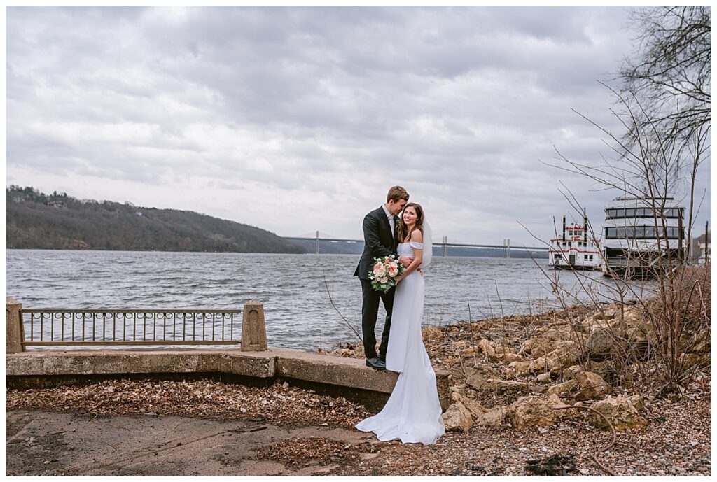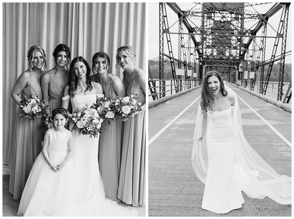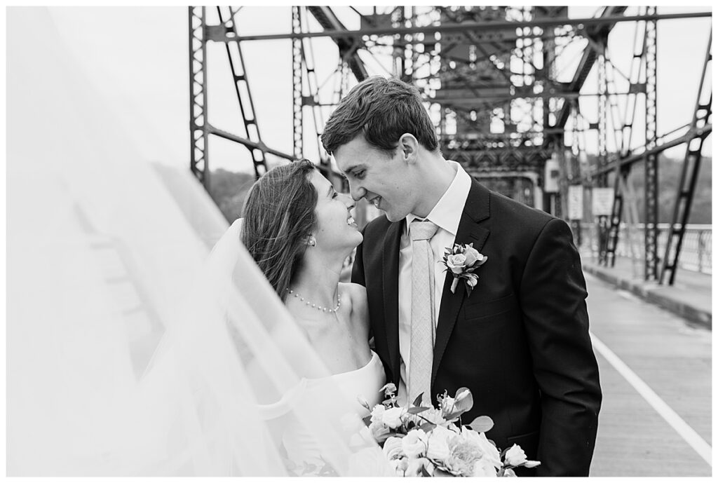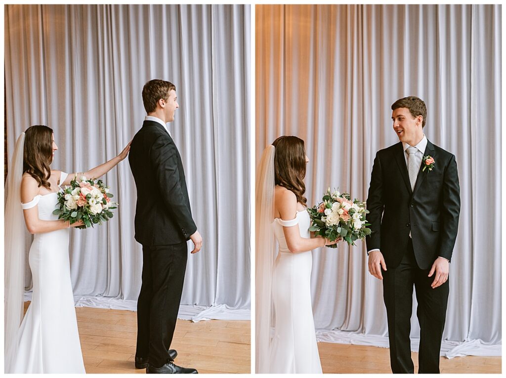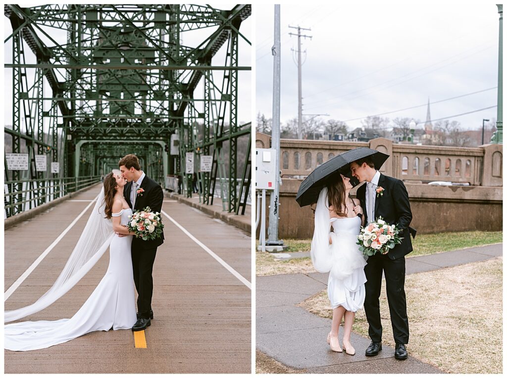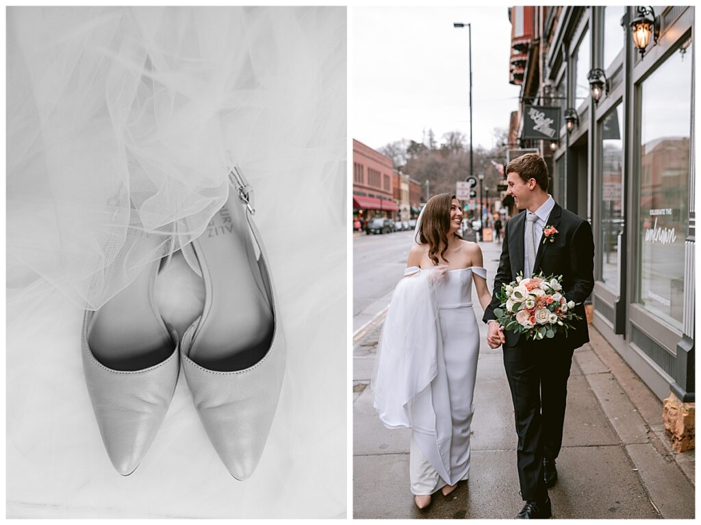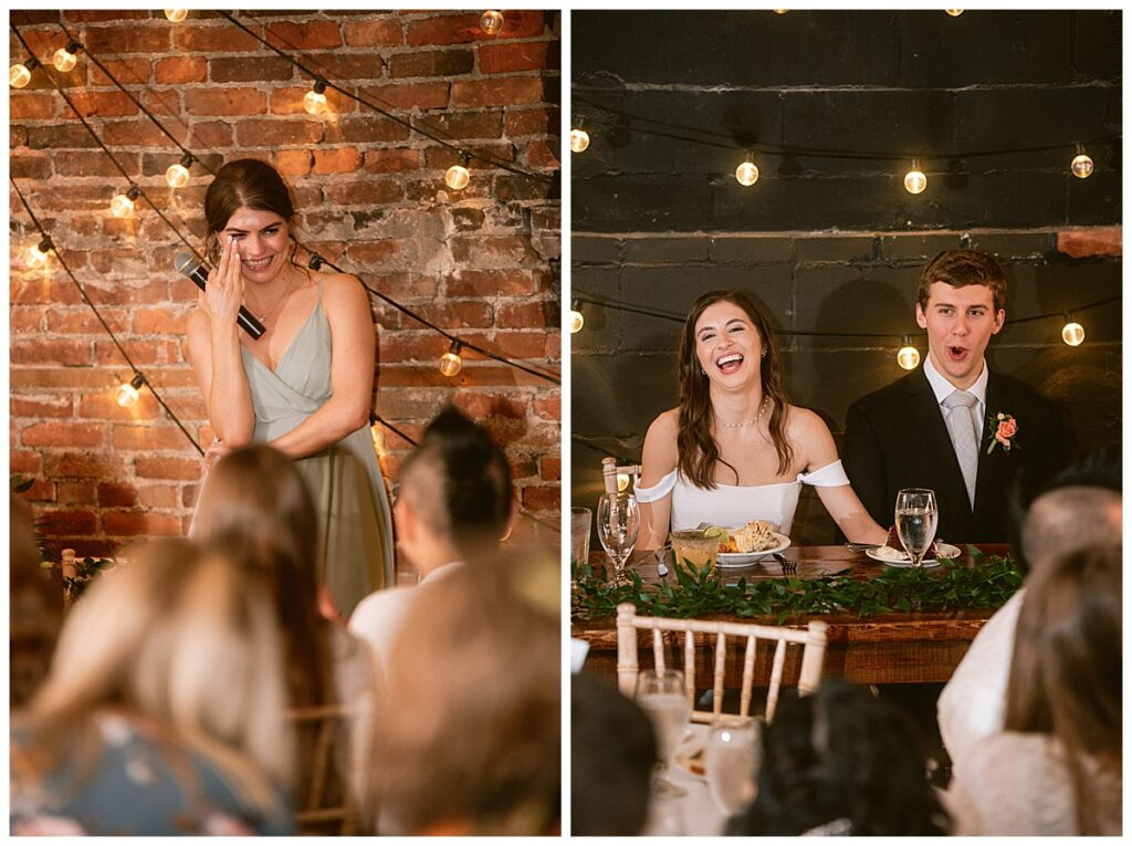 Having friends and family together again was so exciting for Sophia and Teddy and they were so happy to finally be able to celebrate with them. The Loft at Studio J was a perfect location for their April wedding day. This historic industrial building in the beautiful city of Stillwater was a perfect location for both indoor and outdoor photos. Sophia’s lace dress from A&Be Bridal was even more beautiful when paired with the sage bridesmaid dresses from Birdy Grey. Lakeside floral created the most incredible bouquets which held white and melon roses and a variety of greens . Around Sophia’s bouquet, a small pendant from her great grandmother who immigrated to America from Ireland was perfectly placed. Teddy and his groomsmen sported classic black suits with black ties from Atmosfere. Each beautifully decorated table was numbered with a photo of Sophia and Teddy at the age in which the table number was. A blank sheet of paper was also placed at each table so that together guests could write a letter for Sophia and Teddy to open at their future anniversaries. Bella Vida served a tasty meal while Cakealicious provided an incredible cake and sweet cupcakes for the guests. Joe from Day One DJ welcomed the couple and guests to the dance floor and the party began and did not stop until the night was over and there was even a guest song sung by Teddy’s uncle.
