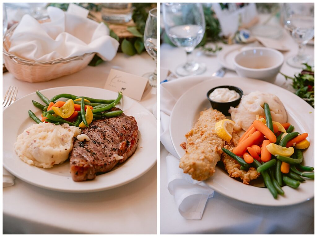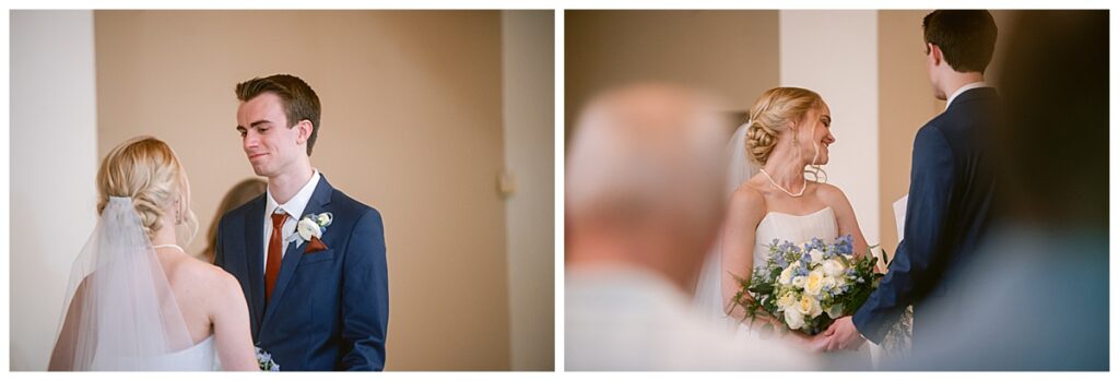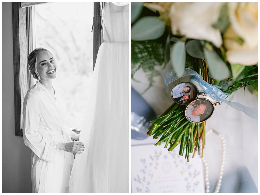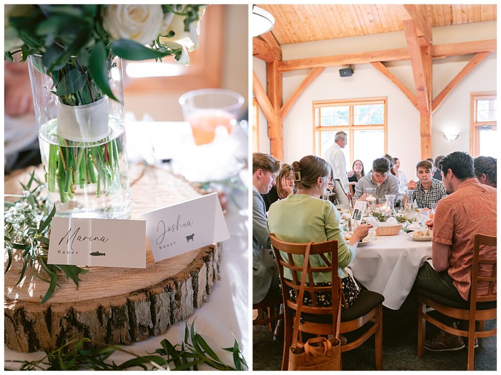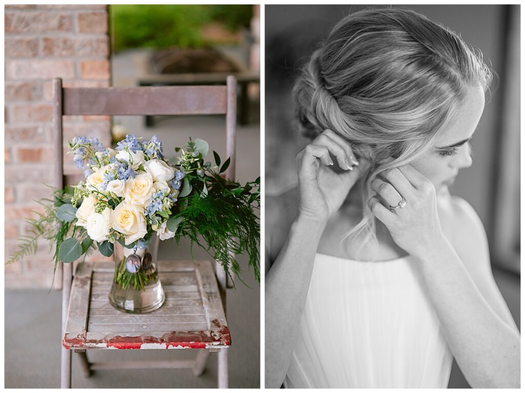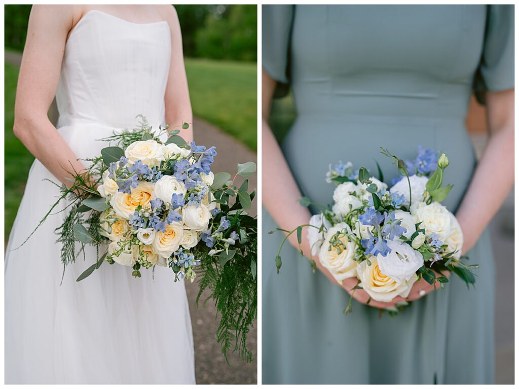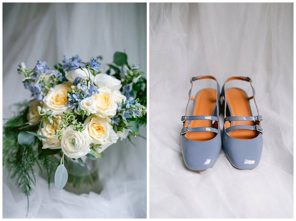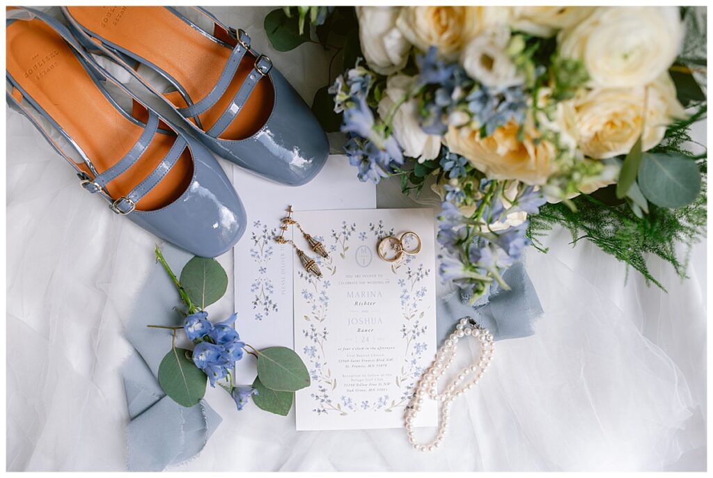 Her gown, handcrafted by Nancy Lindquist, was the perfect reflection of Marina’s classic style. To complement the look, she wore baby blue heels imported from Sézane in France, and blue accents were woven throughout the day—from the soft hues in her Petals to Pines Floral bouquet by Georgia Edgington, to the touches in the stationery, designed through Vistaprint.