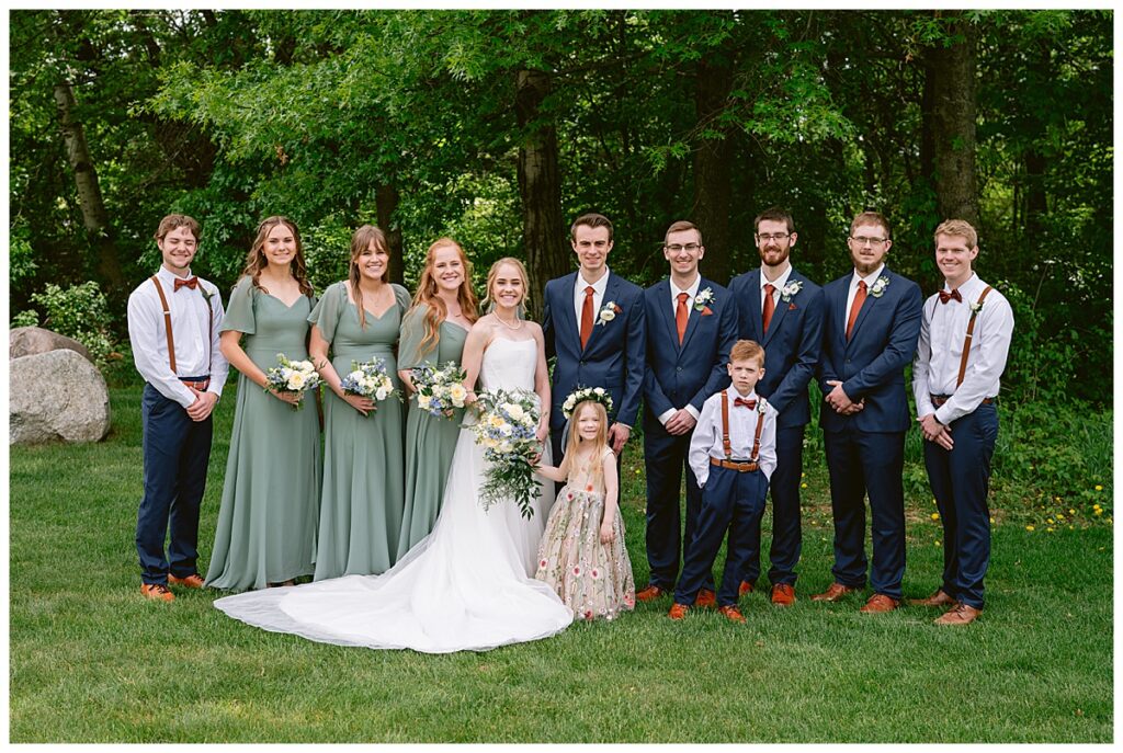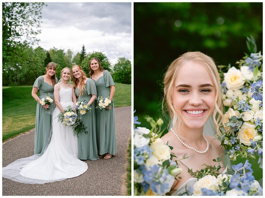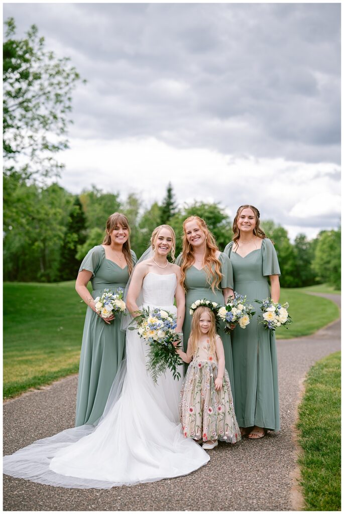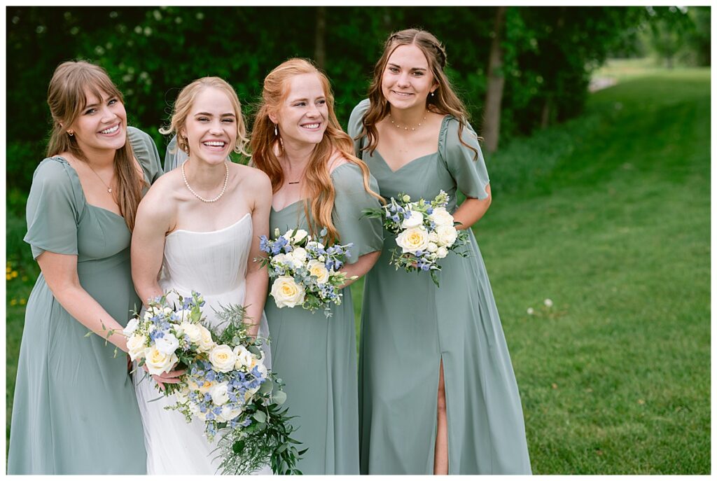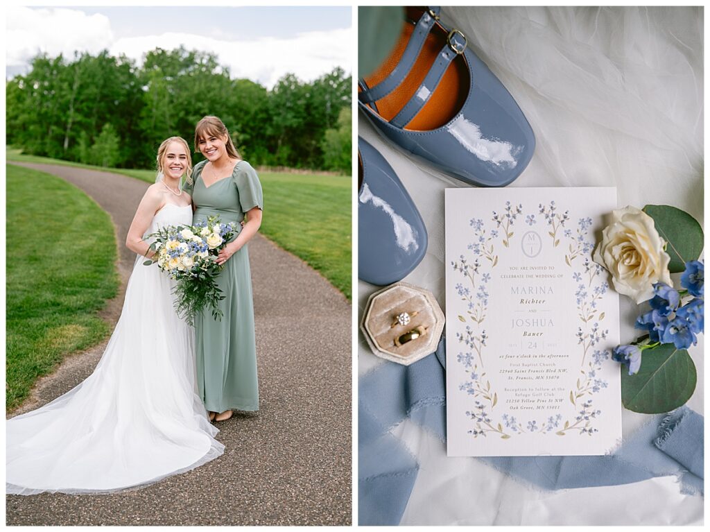 Vendor Team That Made the Day Happen// Venue & Catering: The Refuge Golf Club // Ceremony Site: First Baptist Church of St. Francis // Hair: Amber Ripka – Be Lovely by Amber Ann// Make-Up: Done by the bride // Florals: Georgia Edgington – Petals to Pines Floral of 101 Market // Cake: Hy-Vee of Brooklyn Park // DJ/Band: Jessica Shaw – Bellagala // Stationery: Vistaprint // Wedding Dress: Custom-made by Nancy Lindquist // Bridesmaid Dresses: Baltic Born // Shoes: Sézane (France) // Rings: Thurber Jewelers, Elk River, MN // Earrings & Necklace: Family Heirlooms