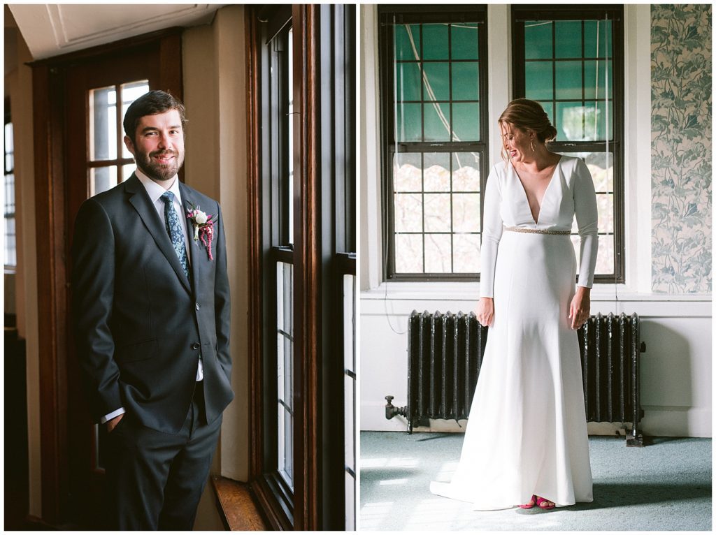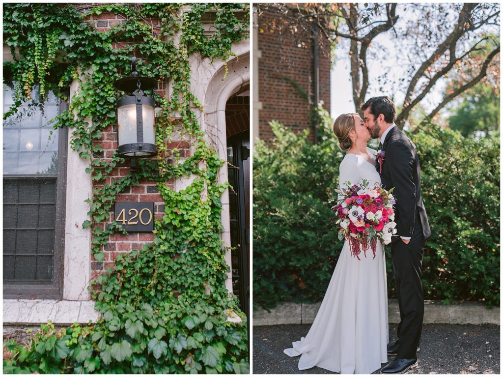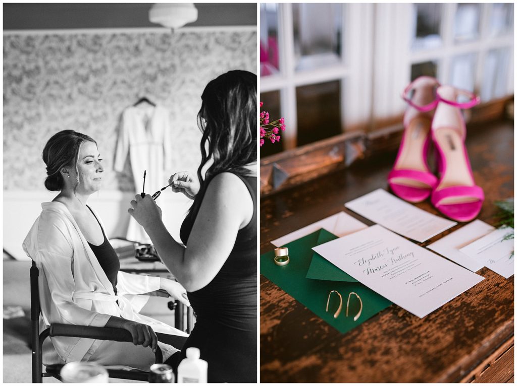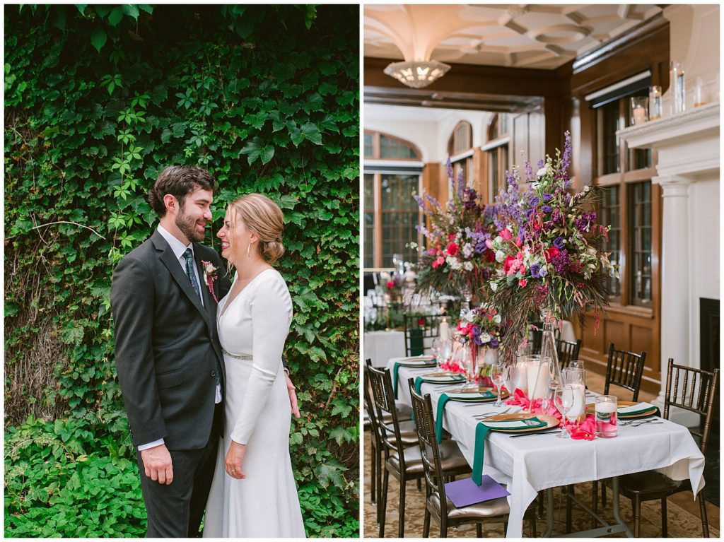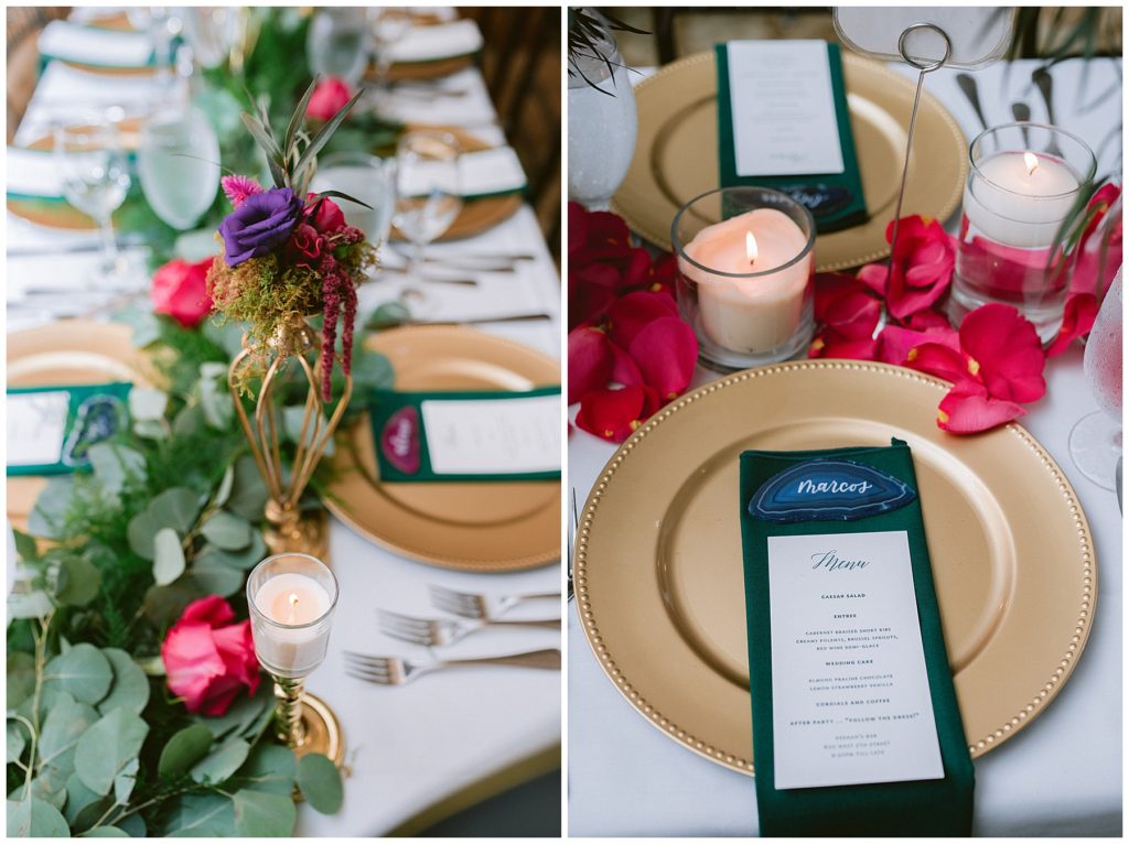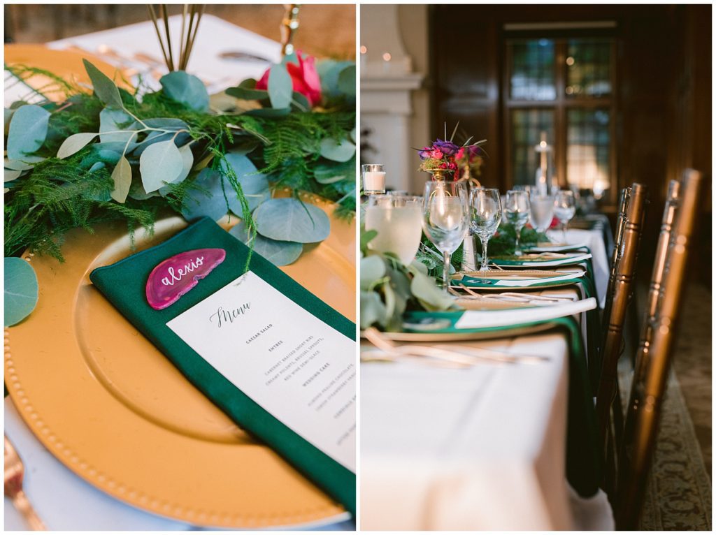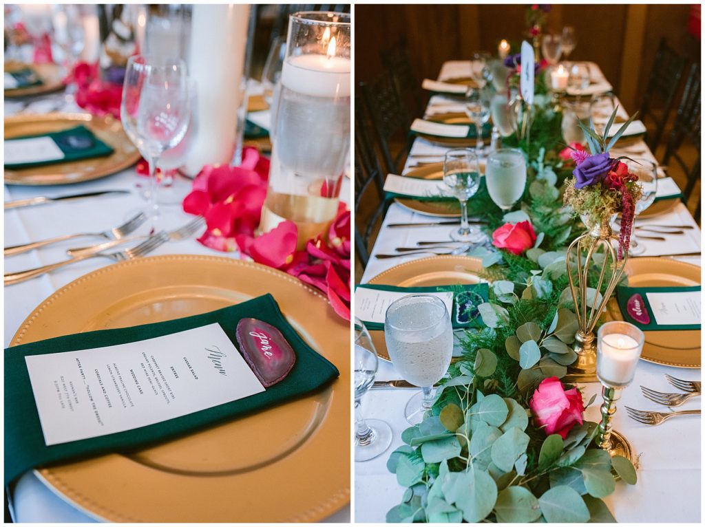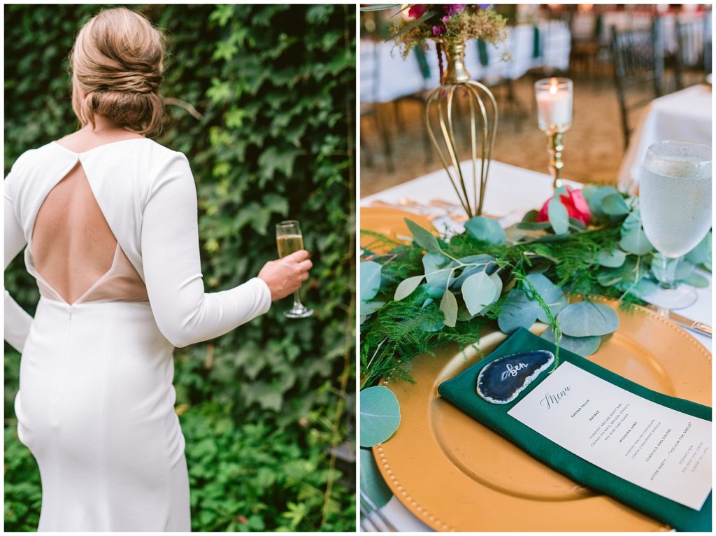 Their September wedding day was beautiful. The two wanted only close friends and family to join their intimate ceremony so they could spend quality time with everyone. Elizabeth’s long sleeve Jenny Yoo gown was classic and elegant and perfect for the wedding day. Her bouquet from La Petite Fleur held hues of pinks, greens and whites and was stunning against her dress and her pink shoes added the perfect pop of color. April of Evergreen Weddings planned each and every detail perfectly and had the reception room looking amazing. The two had so many perfect details to the day including geo name places that were hand scripted with each guest’s name.