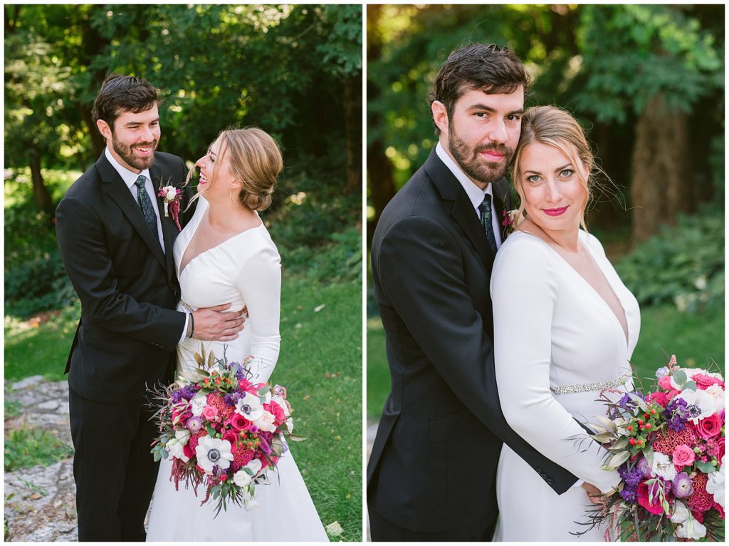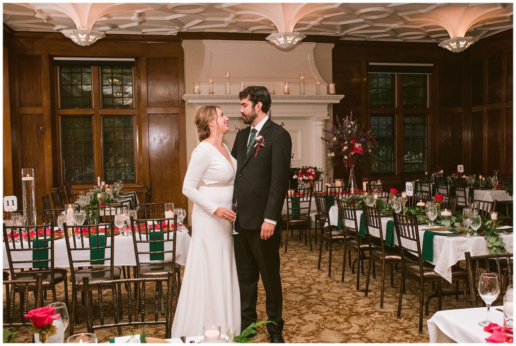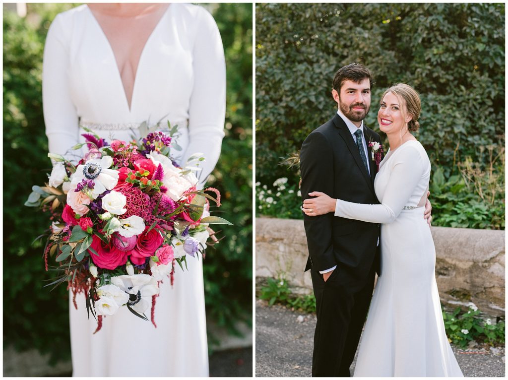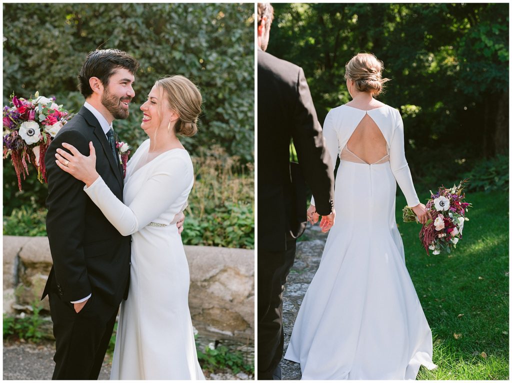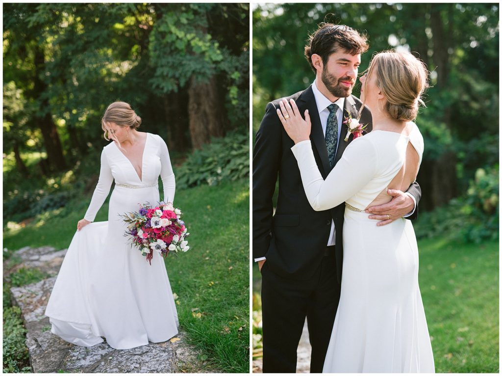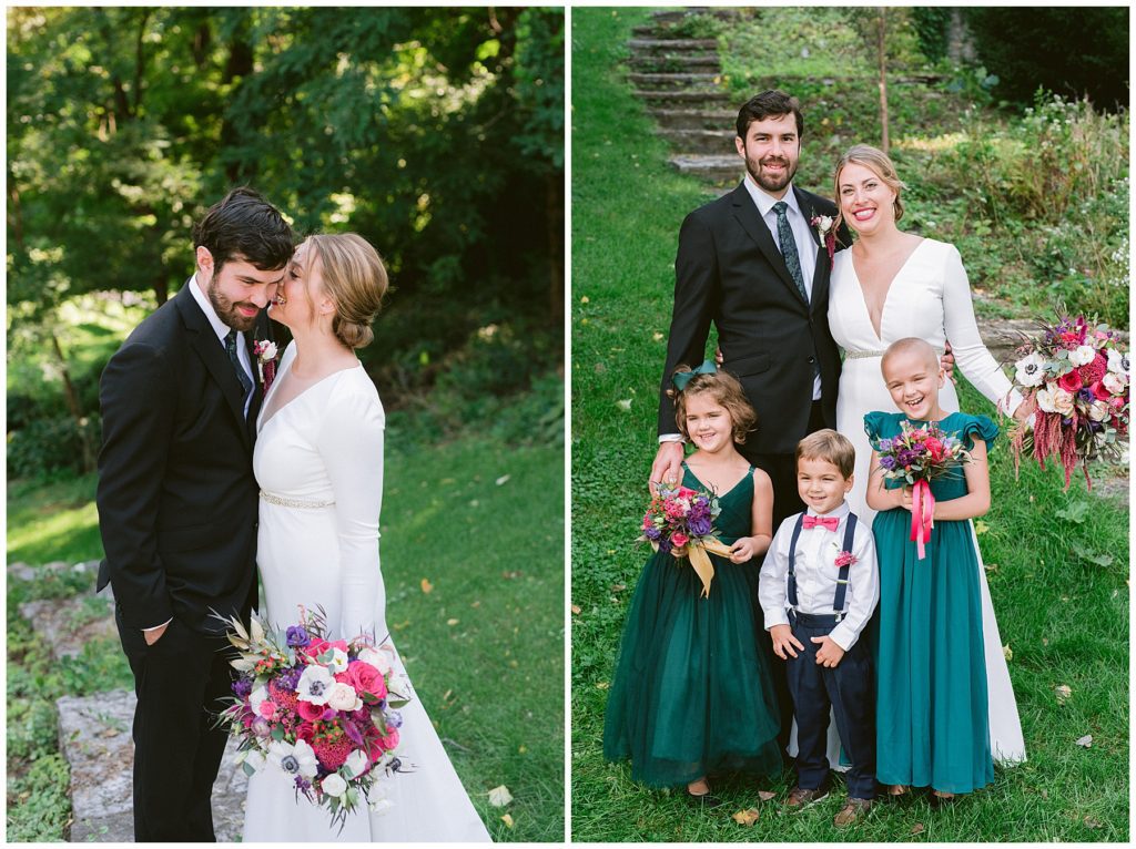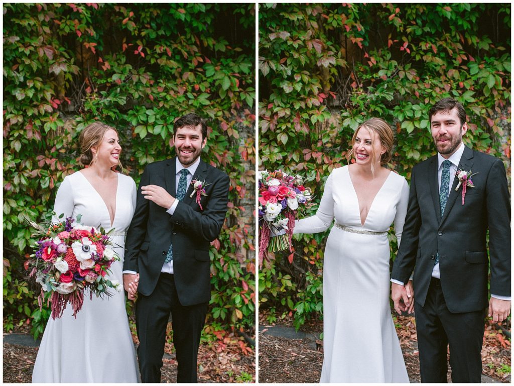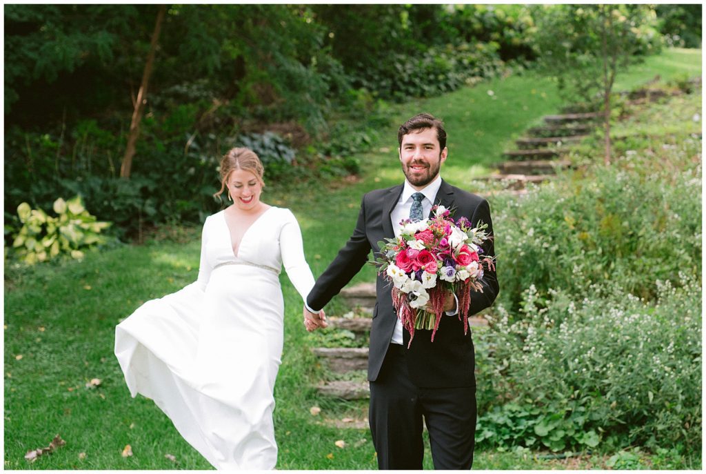 Their September wedding day was beautiful. The two wanted only close friends and family to join their intimate ceremony so they could spend quality time with everyone. Elizabeth’s long sleeve Jenny Yoo gown was classic and elegant and perfect for the wedding day. Her bouquet from La Petite Fleur held hues of pinks, greens and whites and was stunning against her dress and her pink shoes added the perfect pop of color. April of Evergreen Weddings planned each and every detail perfectly and had the reception room looking amazing. The two had so many perfect details to the day including geo name places that were hand scripted with each guest’s name.