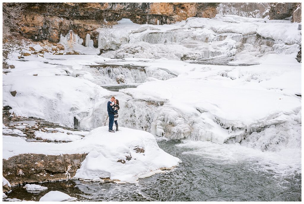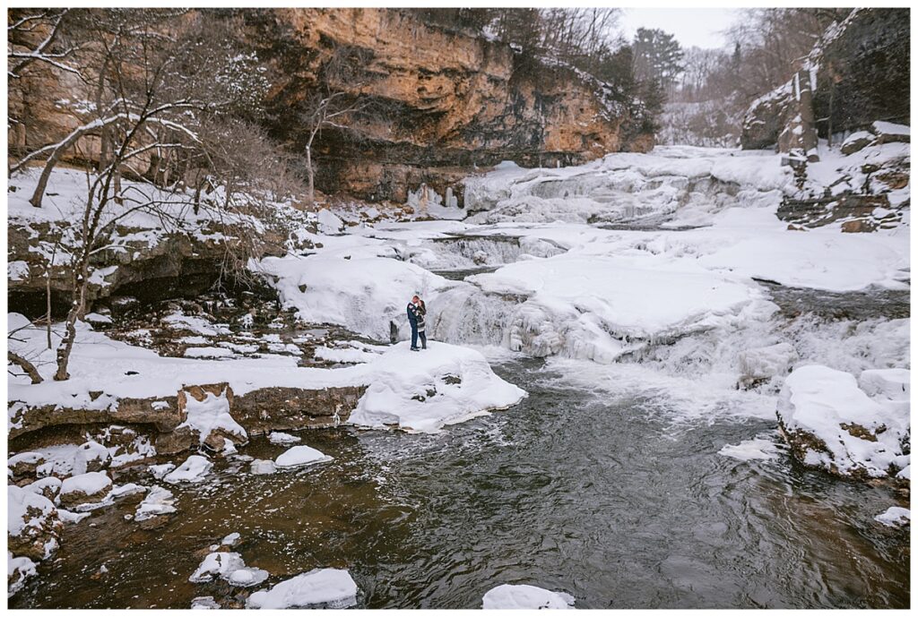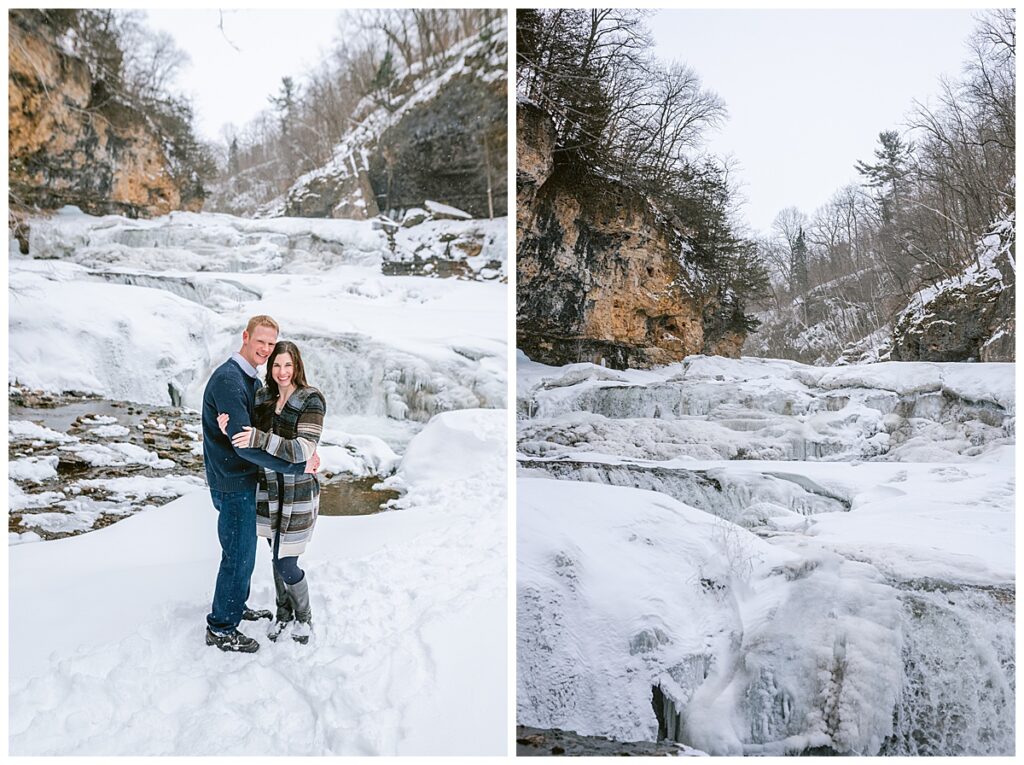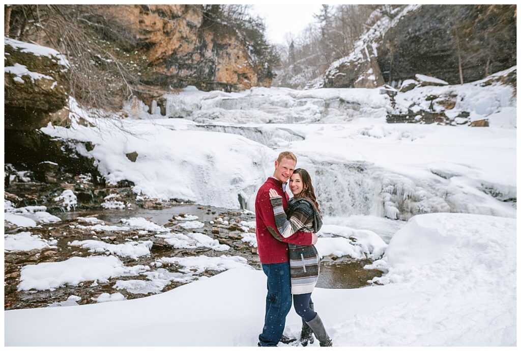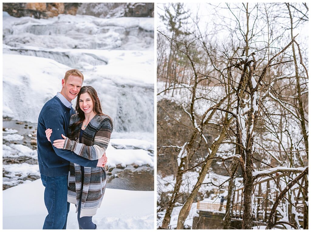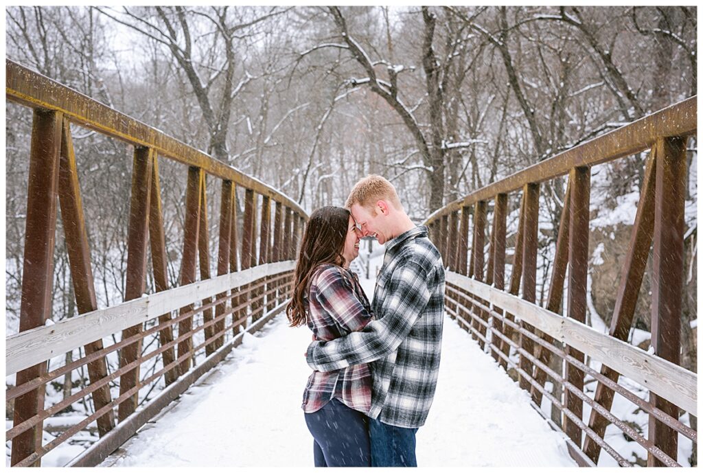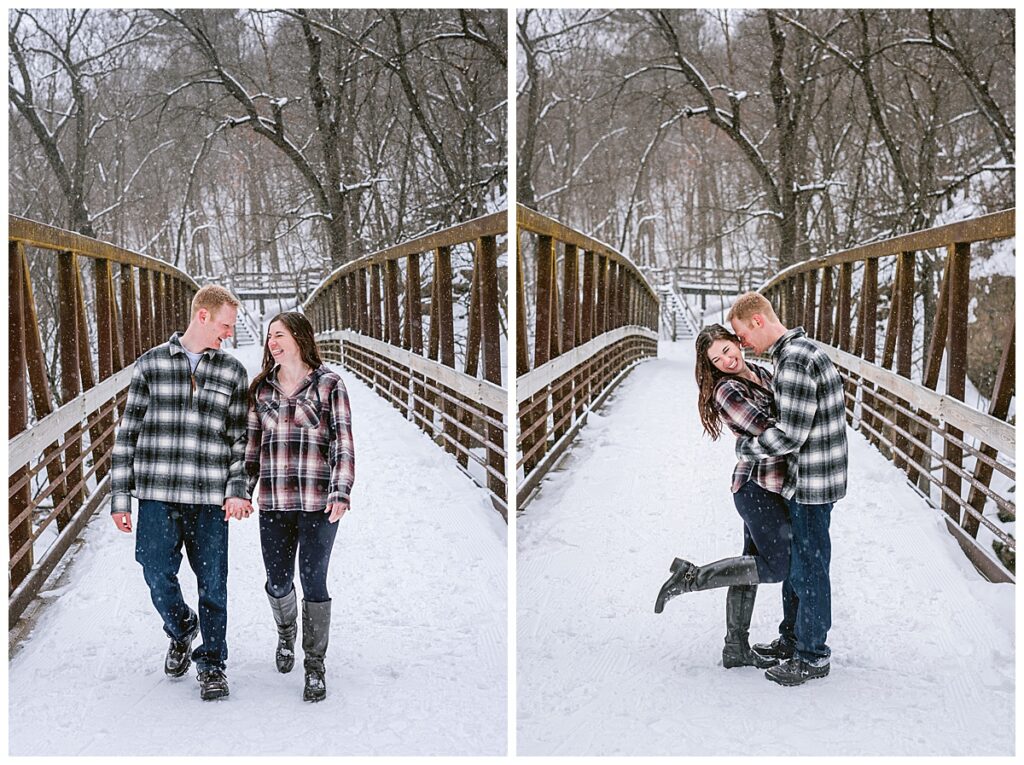 Upon arriving to the waterfall, a light snow began to fall and we were the only ones in the park. We captured the wintry falls and then walked back over a perfect bridge to the parking lot end. I simply can not wait to see them again at their wedding at The Water Street Inn in Stillwater this October!